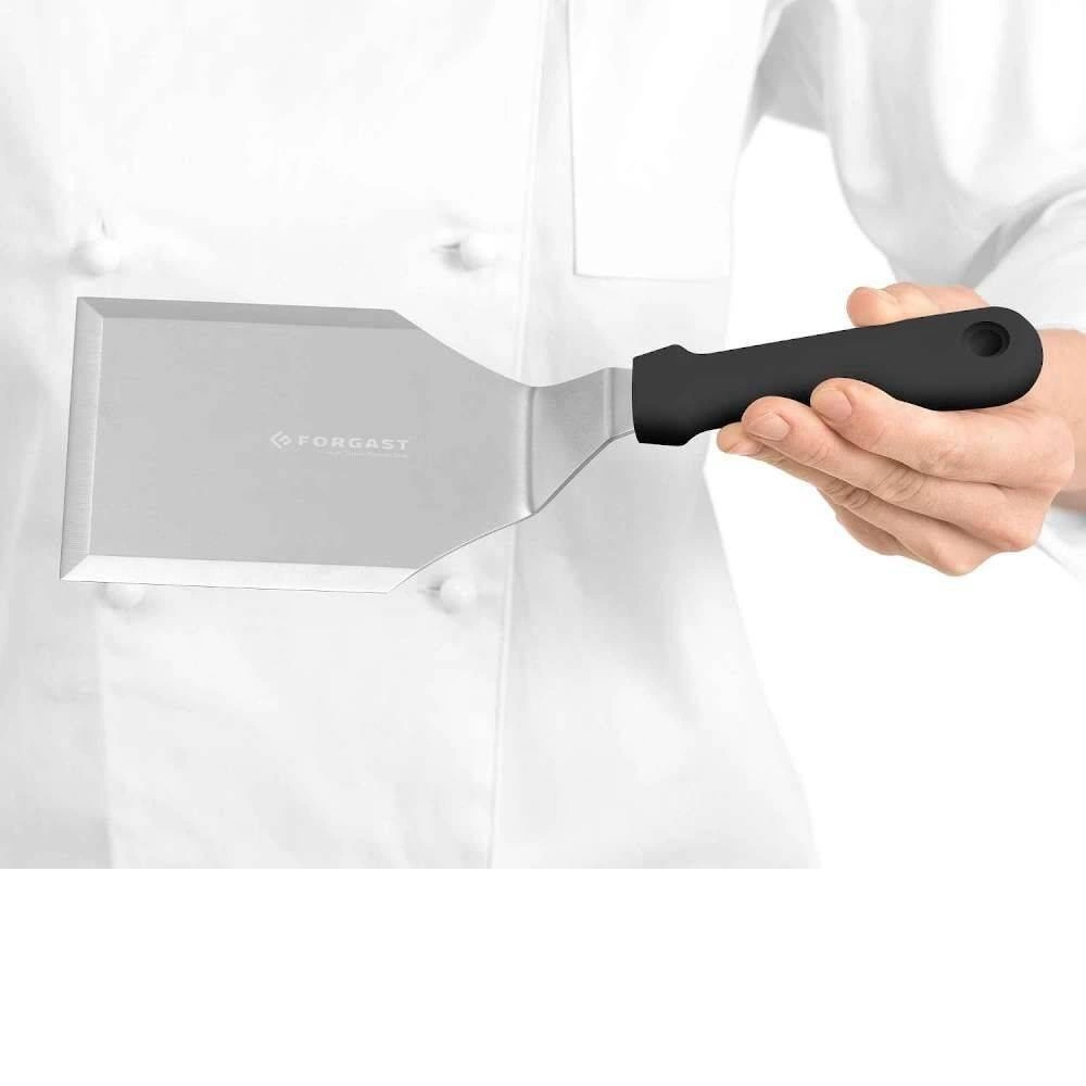 Špachtľa na hamburgery FORGAST FG11221 je robustný kuchynský nástroj určený na profesionálne použitie na grile, v reštaurácii alebo v domácej kuchyni. Vyznačuje sa širokou pracovnou plochou a prevedením z nehrdzavejúcej ocele, čo zaručuje odolnosť a pohodlie pri používaní. Ideálne sa hodí na prípravu burgerov, steakov a ďalších jedál, ktoré vyžadujú otáčanie alebo prenášanie na horúcej platni.