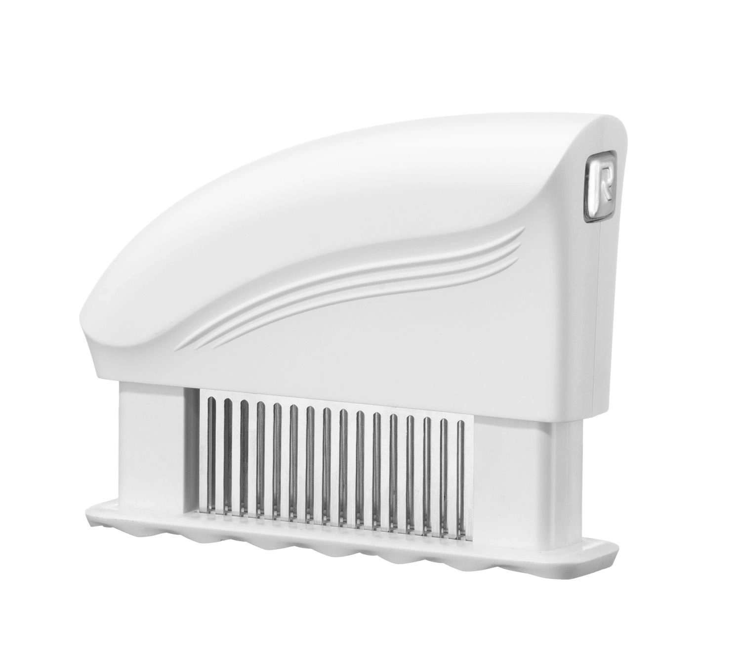 Mäkčovač mäsa - malé zariadenie určené na zmäkčovanie surového mäsa. Umožňuje účinne, bez použitia chemikálií, zjemniť a skrehnúť mäso na pečenie, vyprážanie, grilovanie. Špeciálne navrhnutých 51 čepelí z nehrdzavejúcej ocele sa pri náraze zasunie do plátu mäsa, rozreže ho a jemne naruší vlákna.