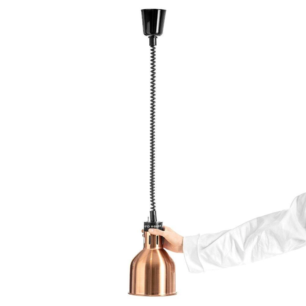 Medená ohrievacia lampa na jedlá - typ A FORGAST FG03340 je profesionálne zariadenie určené na udržiavanie optimálnej teploty pokrmov v gastronomických prevádzkach. Vyznačuje sa elegantným medeným prevedením a možnosťou regulácie výšky, čo ju robí ideálnou pre reštaurácie, svadobné sály alebo cateringové služby. Lampa je vybavená žiarovkou, ktorá vyžaruje príjemné, teplé svetlo a zvýrazňuje atraktívnosť podávaných jedál.