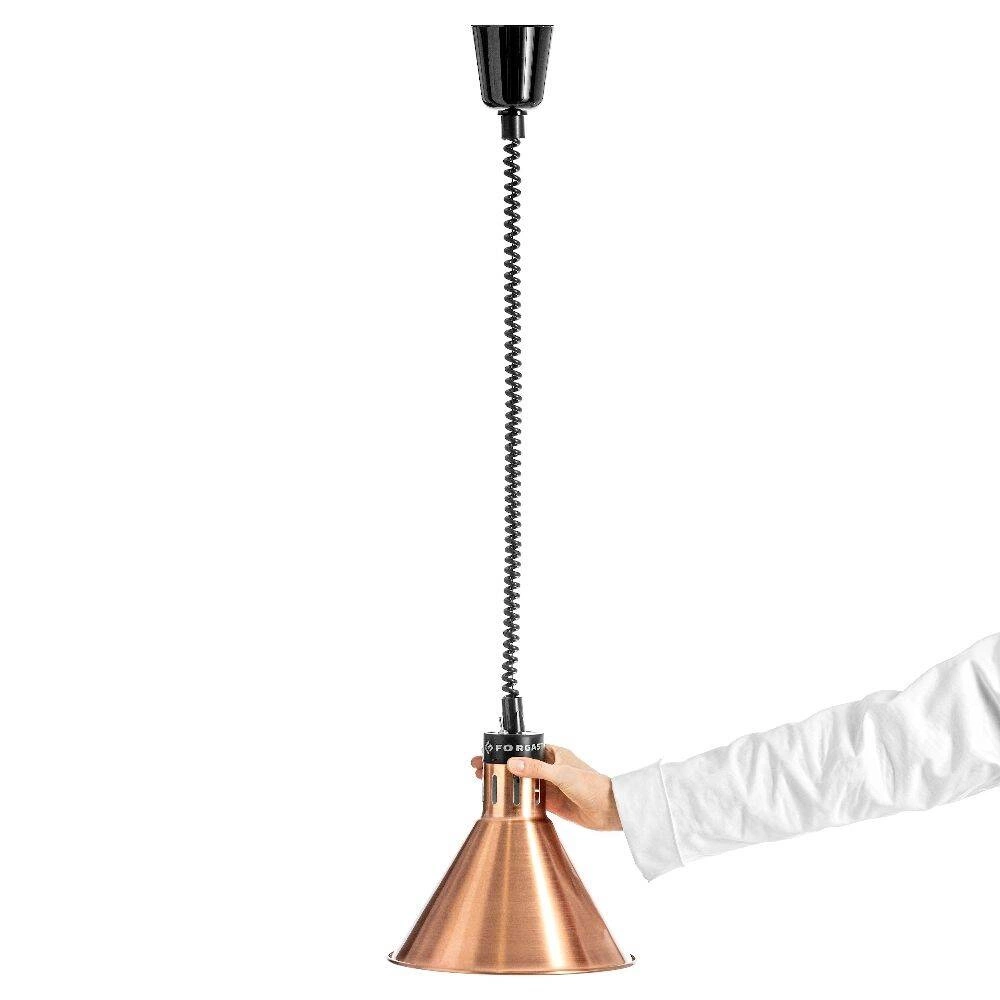 Medená výhrevná lampa na jedlá - typ B FORGAST FG03343 je profesionálne zariadenie určené na udržiavanie teploty jedál v miestach ako sú reštaurácie, svadobné sály alebo cateringové firmy. Vyznačuje sa elegantným medeným prevedením, širokým rozsahom nastavenia výšky a úspornou prevádzkou. Lampa efektívne chráni pripravené pokrmy pred vychladnutím a zabezpečuje im správnu teplotu servírovania po dlhší čas.