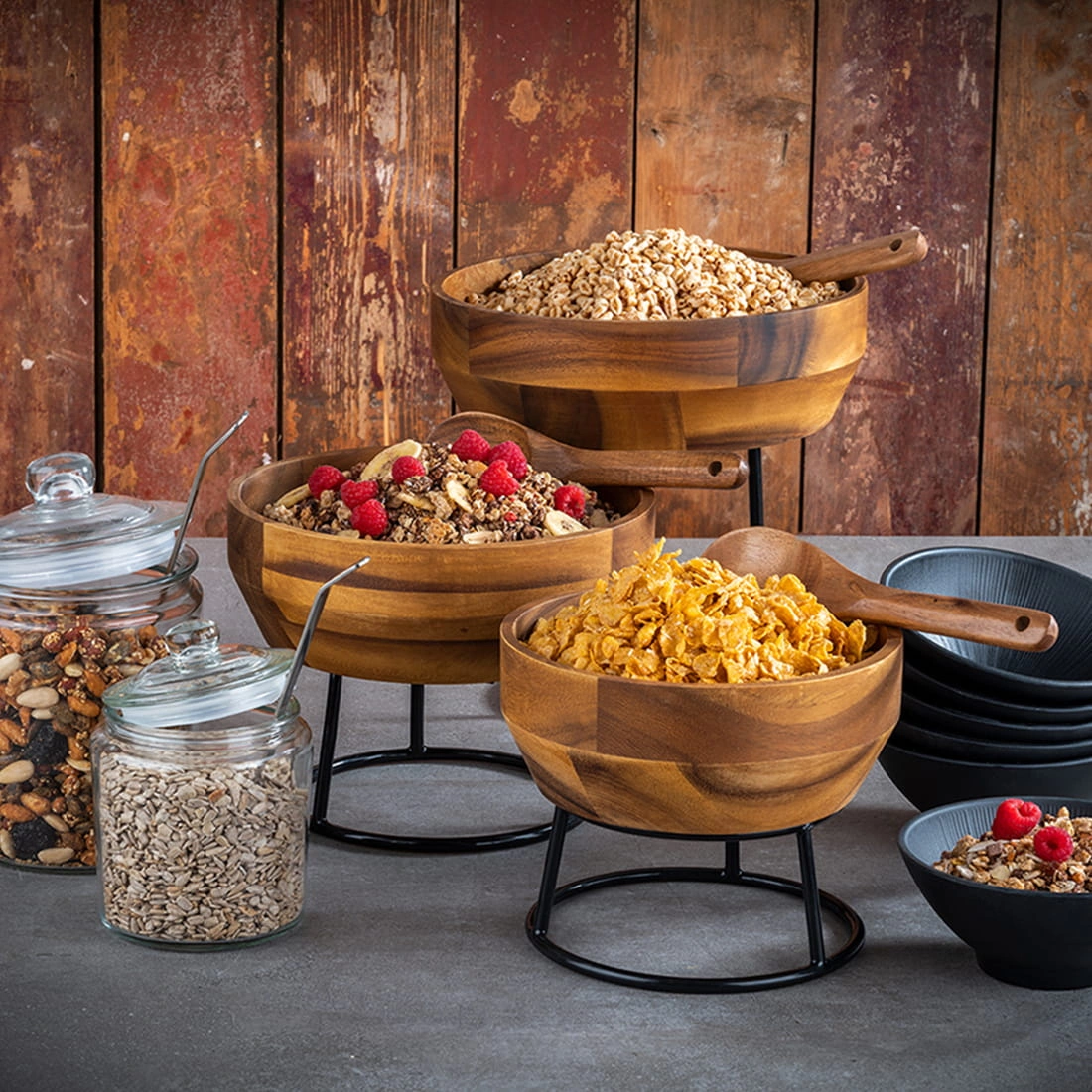 Miska Acacia z akáciového dreva je vysokokvalitná nádoba ideálna na servírovanie rôznych jedál. Vyznačuje sa prirodzeným vzhľadom a pevnou konštrukciou, ktorá sa osvedčí ako v profesionálnych bufetoch, tak aj pri domácich oslavách. Jej univerzálny dizajn umožňuje prezentáciu šalátov, občerstvenia alebo ovocia, čím zvýrazňuje estetiku každej stolovej úpravy.