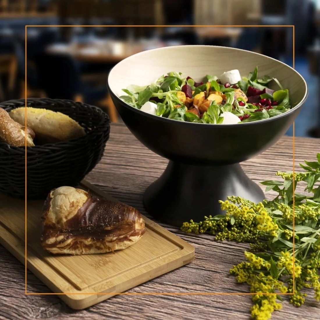 Miska FRIDA bola navrhnutá s ohľadom na moderné bufety a reštaurácie, kde je dôležitá funkčnosť aj pôsobivá prezentácia jedál. Vďaka veľkému priemeru a objemu je ideálna na servírovanie šalátov, hlavných jedál alebo občerstvenia. Šikmý, zvýšený okraj umožňuje pohodlné naberanie pokrmov a chráni ich pred rozliatím. Kombinácia hladkej čiernej a svetlého vnútra imitujúceho drevo spôsobuje, že každé jedlo vyzerá mimoriadne chutne. Špeciálna konštrukcia umožňuje upevnenie misky na otočnej základni, čo je obzvlášť užitočné pri samoobslužných bufetoch.