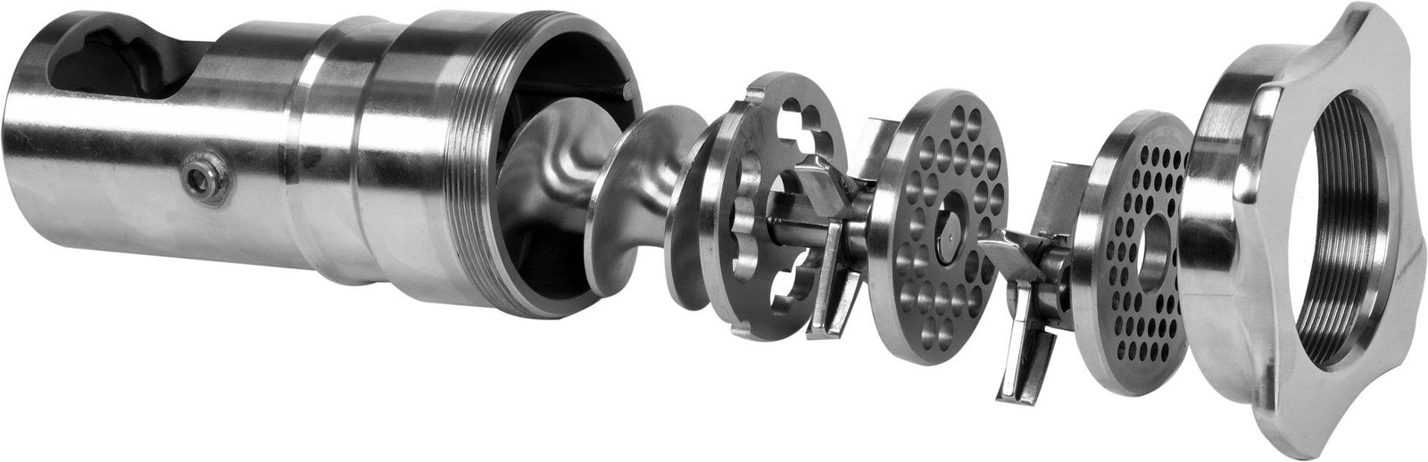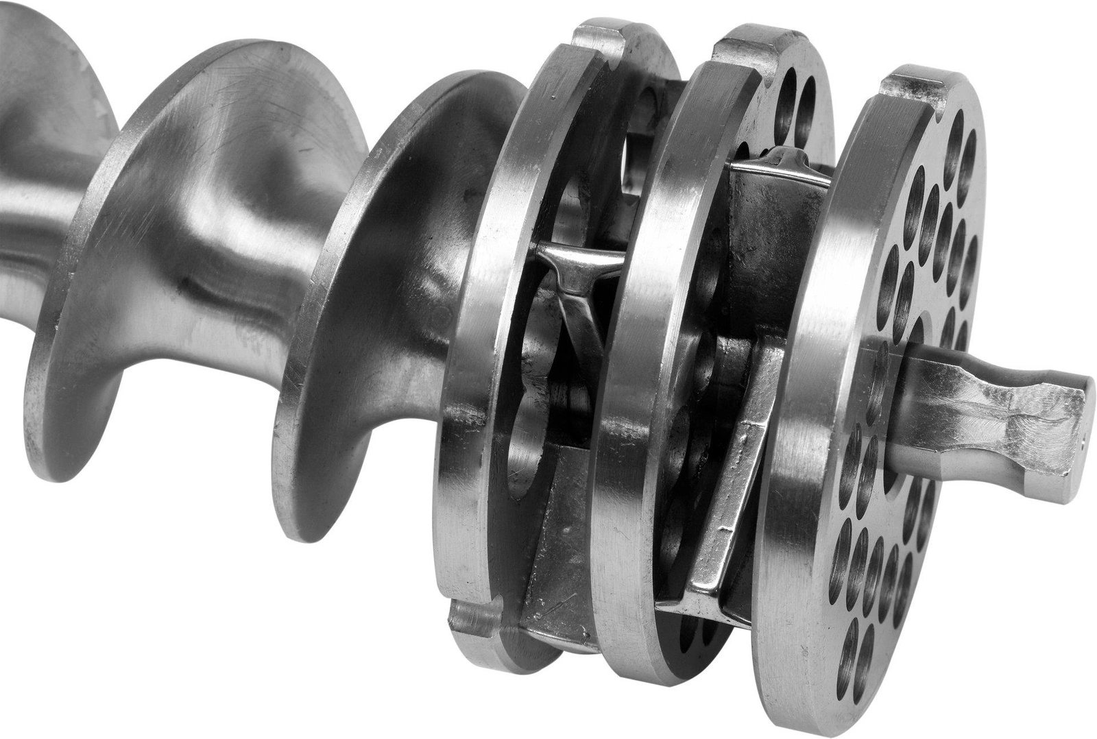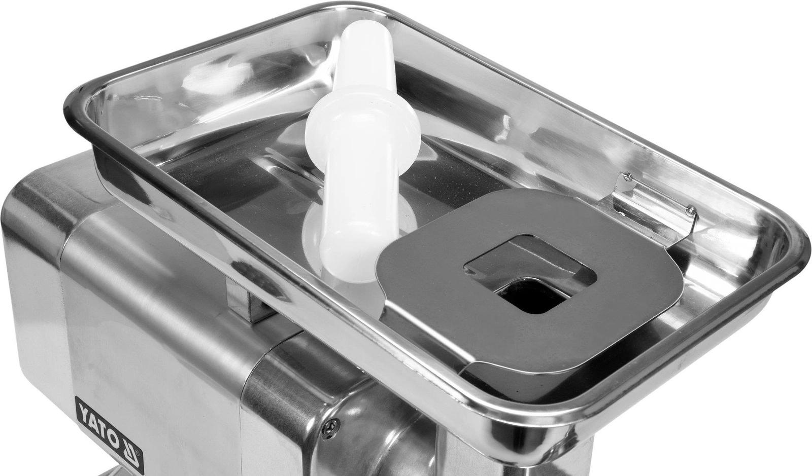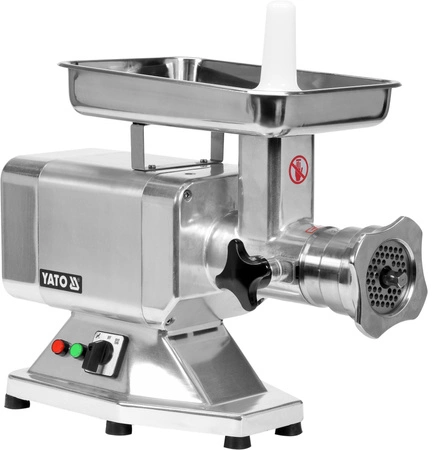Profesionálny mlynček na mäso (vlk) so systémom UNGER značky YATO s orientačnou výkonnosťou 220 kg/hod. Kryt je vyrobený z eloxovaného hliníka. Odnímateľný krk. Nôž, slimák, sitká a podávacia tácka sú vyrobené z nehrdzavejúcej ocele. Systém UNGER, obzvlášť užitočný na prípravu klobás a údenín, pozostáva z: trhača, obojstranného 4-ramenného rezacieho noža a krku s priemerom 8 cm. Pohon vlka má funkciu spätného chodu, ktorá uľahčuje čistenie zariadenia po ukončení práce. Možnosť zloženia podávacej tácky. Zariadenie je vybavené ochranou proti preťaženiu. V základni je namontovaných 6 gumových nôh, ktoré zabraňujú posúvaniu zariadenia počas práce.