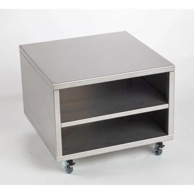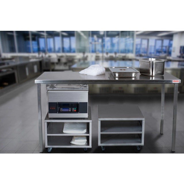 Základňa je celá vyrobená z vysokokvalitnej nehrdzavejúcej ocele (CNS), ktorá je odolná proti korózii, trvácna a ľahko sa čistí. Je vybavená štyrmi otočnými kolieskami, z ktorých dve majú brzdy, čo zabezpečuje ľahký pohyb a stabilitu počas používania. Praktický úložný priestor zabudovaný v základni umožňuje uskladnenie príslušenstva, ako sú vákuové vrecká alebo náradie, čo výrazne zlepšuje organizáciu pracoviska.