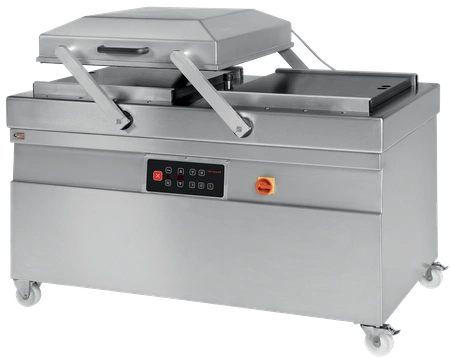 Baliaci stroj je vybavený štyrmi tesniacimi tyčami a dvoma priestrannými komorami optimálnej veľkosti, ktoré umožňujú balenie väčšieho počtu výrobkov súčasne. Výkonná vákuová pumpa s výkonom 100 m³/h zabezpečuje rýchle a účinné odstránenie vzduchu, zatiaľ čo presný digitálny ovládací panel LED umožňuje jednoduché riadenie procesu balenia.