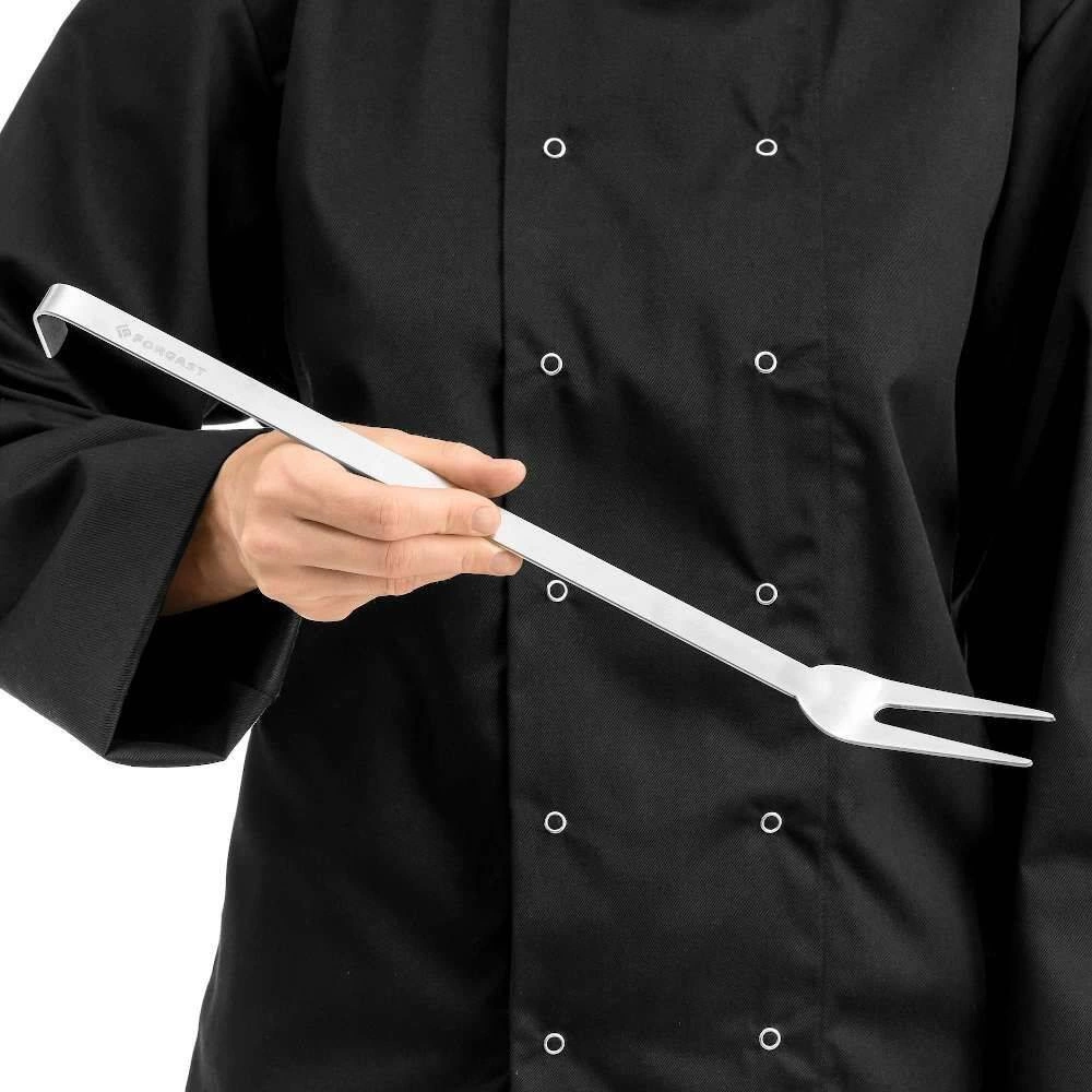 Servírovacia vidlica monoblok dĺ. 40 cm FORGAST FG11340 je profesionálny kuchynský nástroj určený na obracanie a servírovanie veľkých kusov mäsa. Vyznačuje sa mimoriadnou odolnosťou, robustným spracovaním a praktickým háčikom na zavesenie. Je ideálna do intenzívne využívaných reštauračných kuchýň, ako aj pri grilovaní alebo na veľkých cateringových akciách.
