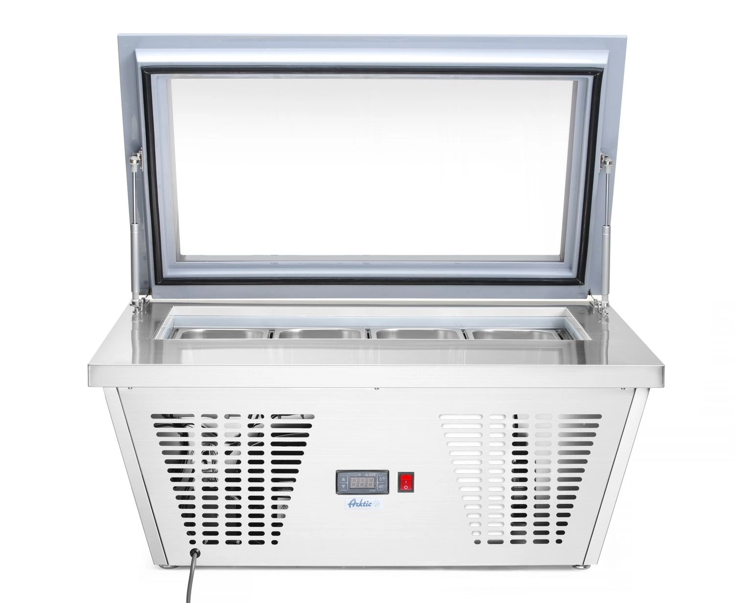 Mraziaca vitrína nastaviteľná s objemom 77 l. Kryt je vyrobený z nehrdzavejúcej ocele. Potróy presklené veko s jednoduchým otváraním.