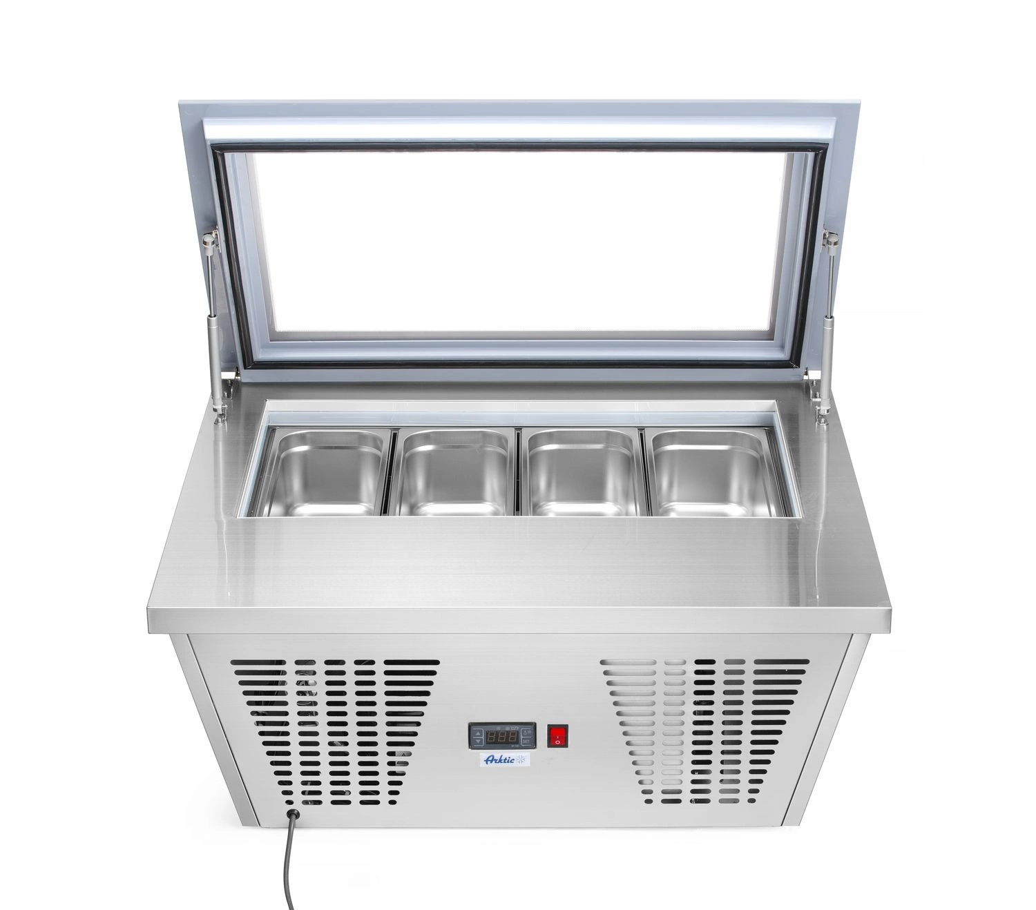 Kapacita - 4 zásobníky na zmrzlinu s rozmermi 36x16,5x12 cm. Digitálny displej, elektronický termostat. Priame statické chladenie s automatickým odmrazovaním. Teplotný rozsah -24/-20°C. Výškovo nastaviteľné nožičky.