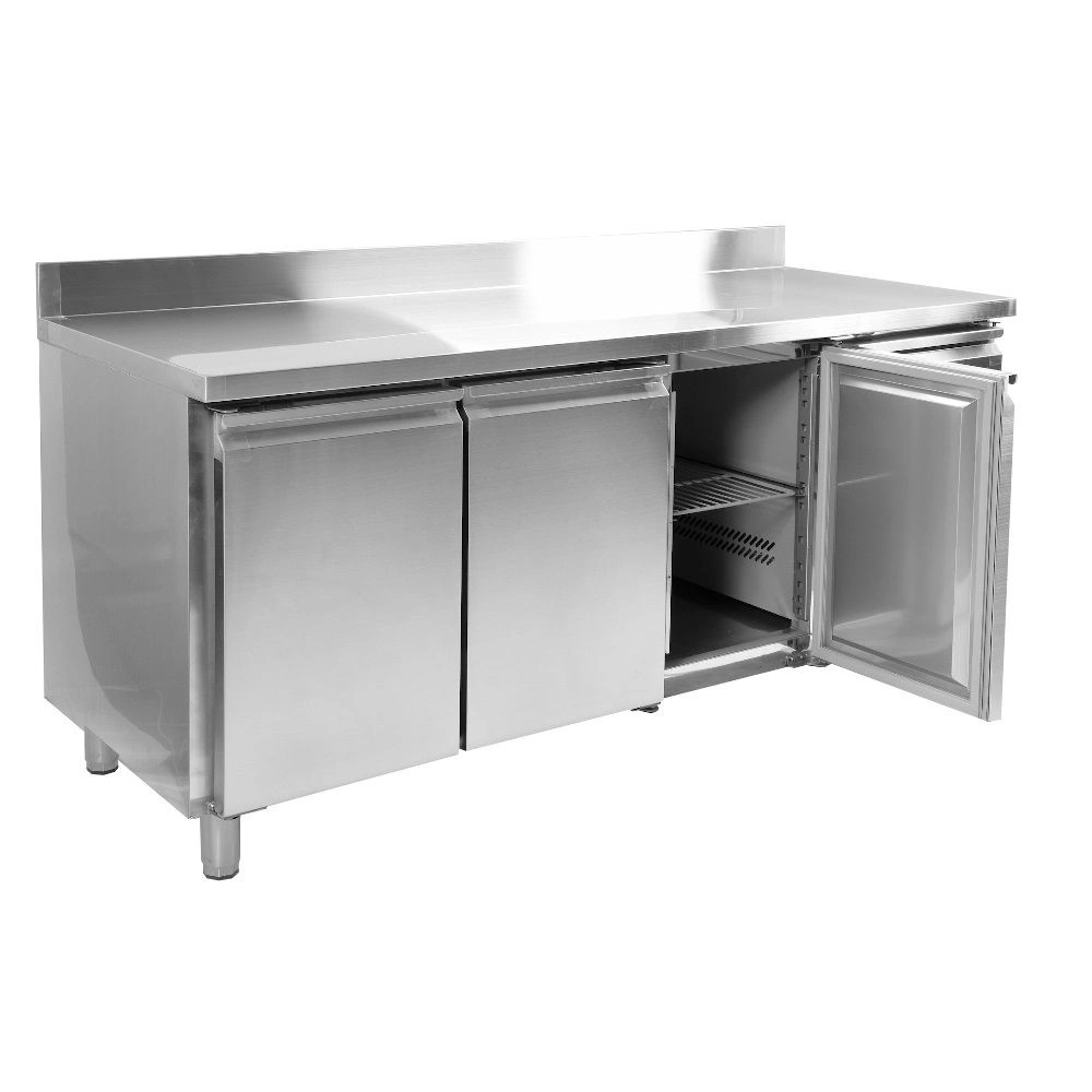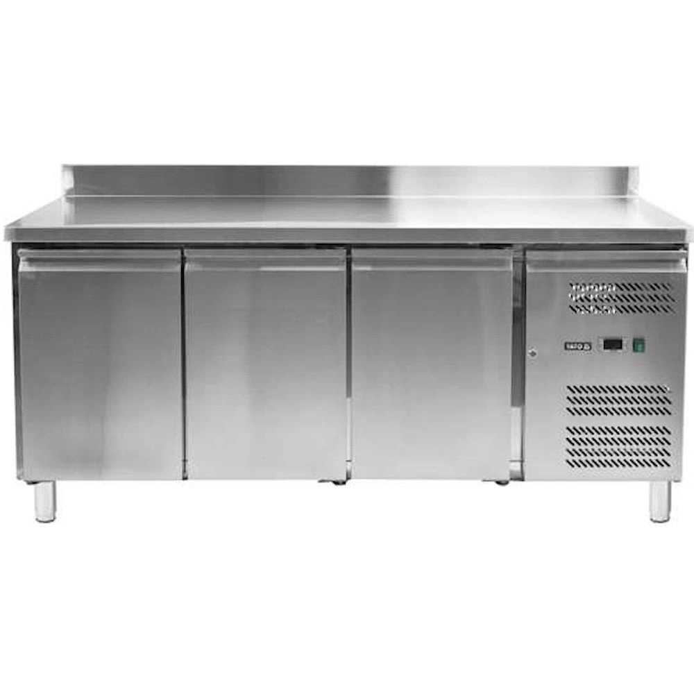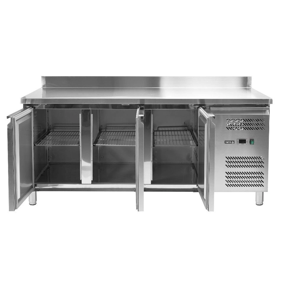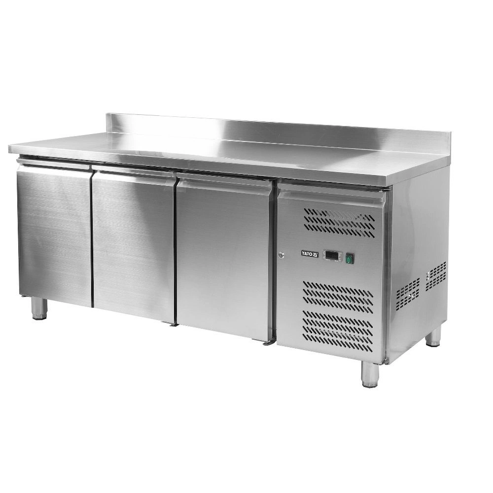 3-dverový mraziaci stôl značky YATO - línia 700. Objem 417 l. Vnútorný a vonkajší plášť je vyrobený z nehrdzavejúcej ocele ss201. Pracovná doska z nehrdzavejúcej ocele so zadným lemom vysokým 10 cm. Samozatváracie dvere majú pohodlné úchyty na otváranie. Vybavenie obsahuje 3 roštové police (po 1 na každé dvere), potiahnuté PVC, s nosnosťou 40 kg každá – pri rovnomernom zaťažení. Komora je prispôsobená na skladovanie GN 1/ nádob. Stôl je postavený na 4 nožičkách s možnosťou nastavenia výšky 12-18 cm. Bočná chladiaca jednotka 560 W využíva chladiaci prostriedok R290, určená je na prevádzku v 4. klimatickej triede – pri maximálnej teplote okolia 30o C a relatívnej vlhkosti 55 %. Zariadenie má elektronický ovládač s digitálnym displejom teploty. Priemerná ročná spotreba energie je 3103 kWh.
