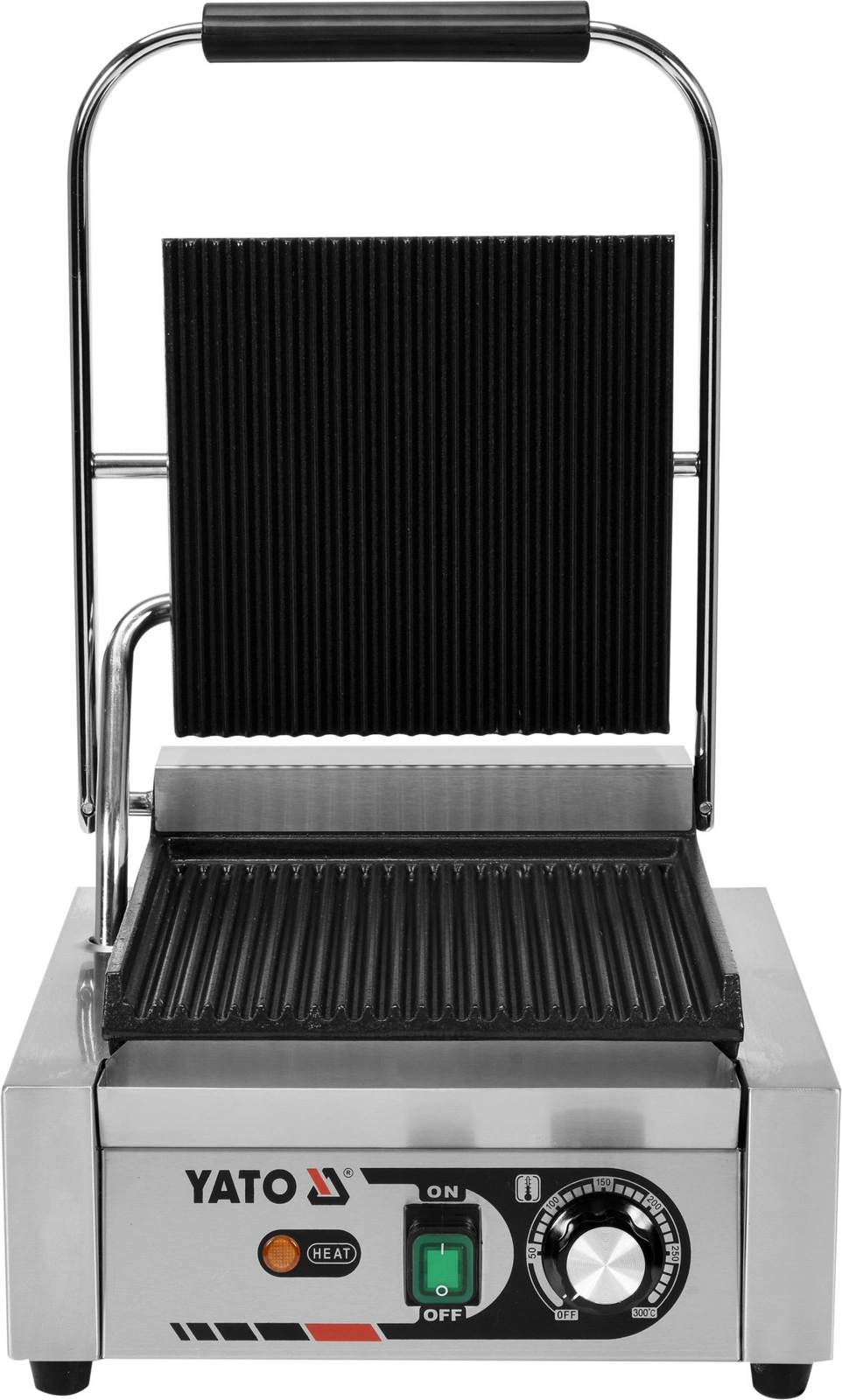 Mriežka s jedným kontaktom od spoločnosti YATO rozmery 31x37x20,5 cm. Je určený na rýchlu prípravu hamburgerovómäsa, rýb, tortilly, toastovóalebo zeleniny. Je vyrobená z vysokokvalitnej nehrdzavejúcej ocele. Kanálik na tuk na prednej strane dosky a špeciálny otvor na kvapky uľahčujú jej čistenie. Liatinová grilovacia doska s rozmermi 23 × 22,5 cm je dokonalým nástrojom, ktorýóvám umožní vyprážať viacero výrobkovósúčasne z oboch strán. Vďaka svojej vlnitej štruktúre na hornej aj spodnej strane zaručuje táto grilovacia doska rovnomerné a účinné pečenie. Ohrievač s výkonom 1,8 kW sa ovláda potenciometrom na prednej doske. Teplotu je možné nastaviť v rozsahu 50~300 ordm;C.