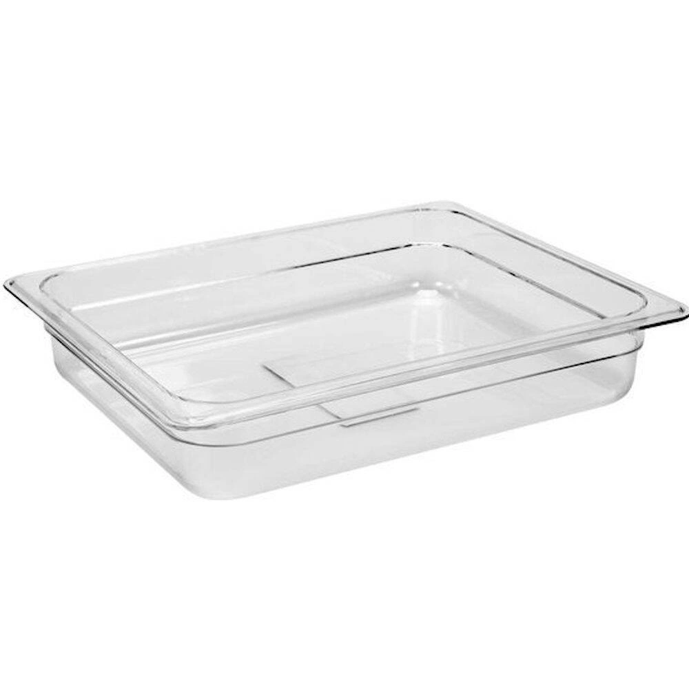 GN 1/2 cateringová nádoba s hĺbkou 6,5 cm a objemom 3,9 litra. Nádoba je vyrobená z polykarbonátu najvyššej kvality, veľmi pevná a odolná voči poškodeniu. Hladký povrch a hrany a zaoblené rohy uľahčujú udržiavanie čistoty nádoby. Polykarbonát neabsorbuje žiadne látky ani pachy, ani nenarušuje chuť skladovaných potravín. Odolný voči teplotám od - 40oC až 99oC, takže nádobu možno uchovávať v chladničke aj v nej skladovať teplé potraviny. Nádoba nie je určená na použitie v bemeroch a peciach KP. Okrem toho sú nádoby vybavené litrovou stupnicou, aby bolo možné kontrolovať hladinu obsahu. Nádoba má po obvode dodatočný reliéf, ktorý spevňuje jej konštrukciu, zabraňuje pokrčeniu počas používania a umožňuje stohovanie. Nádoba je vhodná na umývanie v umývačke riadu.