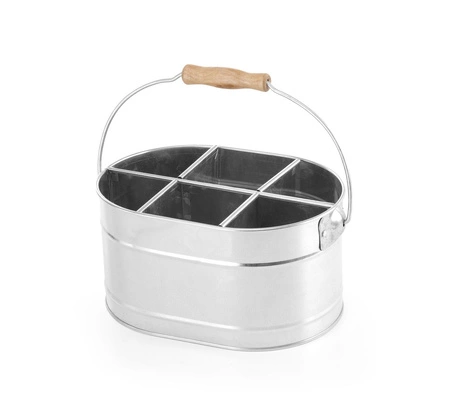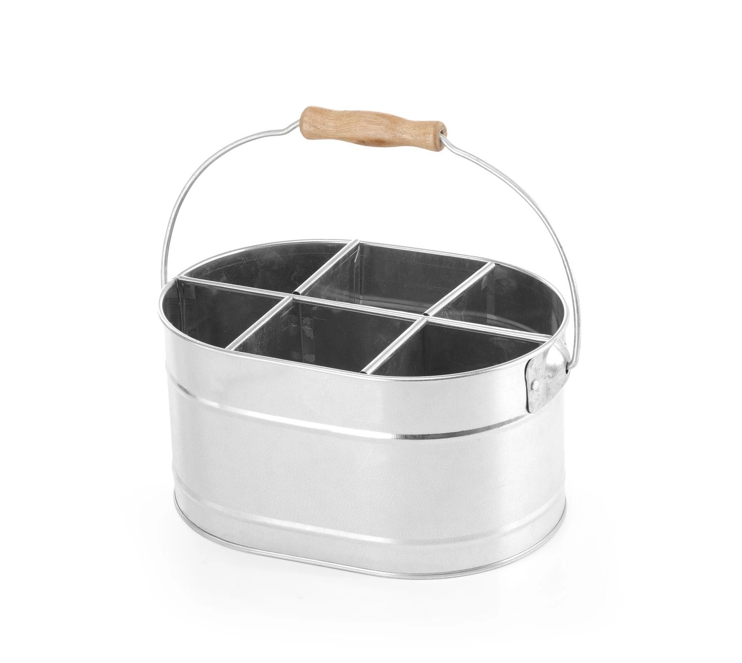Nádoba v tvare vedra na príbory a obrúsky s drevenou rukoväťou. Vyrobená z pozinkovaného oceľového plechu v rustikálnom štýle.