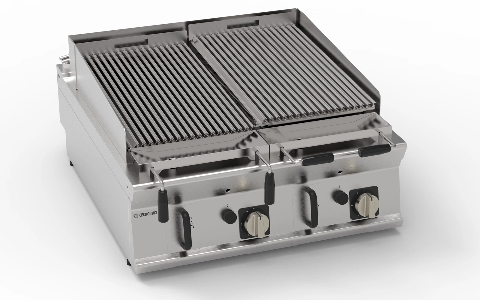 Popis Lávový gril TECNOINOX 313205 je profesionálny plynový spotrebič s dvoma nezávislými grilovacími zónami s plochou 62 × 36 cm. Kombinovaný výkon 20 kW zaisťuje rýchly ohrev a vysoký pracovný výkon, ideálny na intenzívne používanie v gastronómii. Spotrebič je určený na presné a rovnomerné grilovanie rôznych druhov mäsa, rýb a zeleniny.