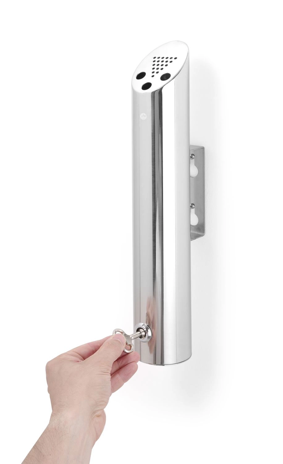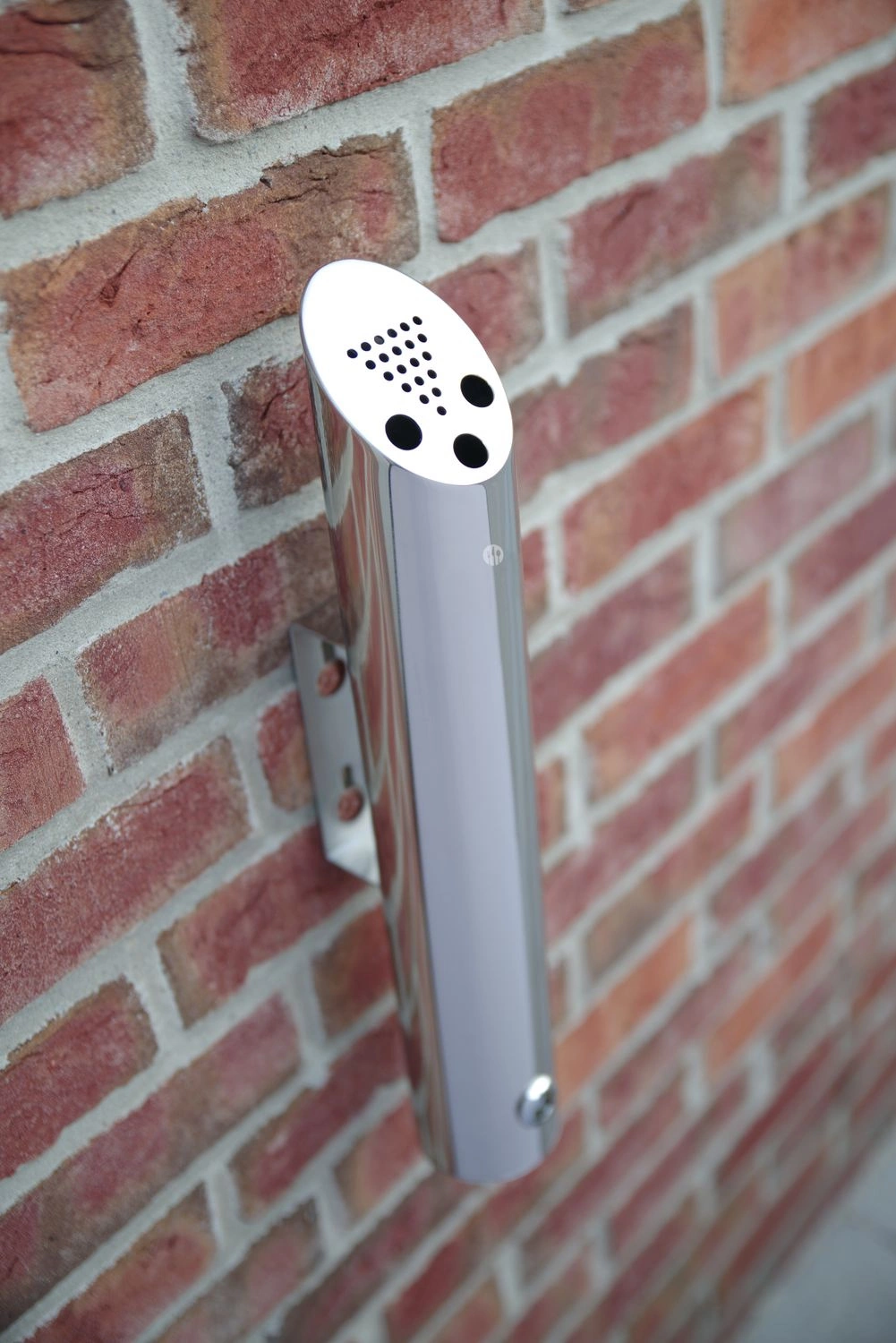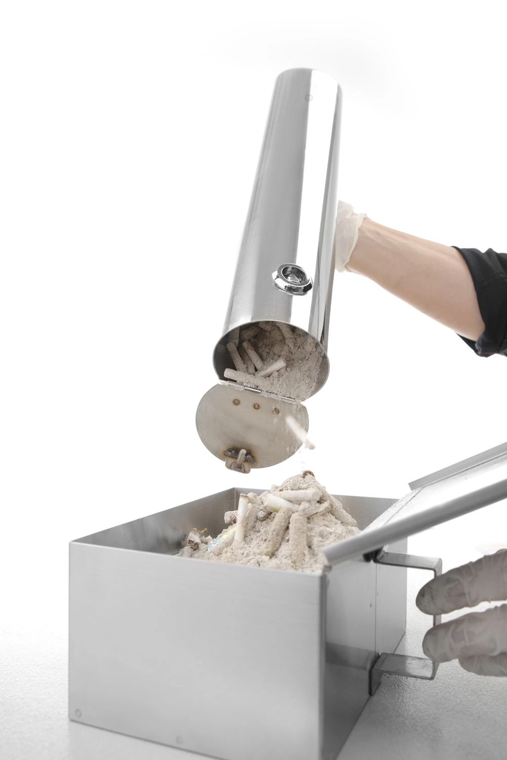Nástenný popolník. Robustná konštrukcia, jednoduchá inštalácia na steny a stĺpy. Jednoduché čistenie popolníka otvorením dna, uzamykateľný kľúčom.