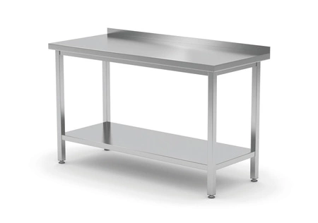 Nástenný pracovný stôl s pó³. Vyrobené z nehrdzavejúcej ocele AISI 430, skrutková konštrukcia. Nastaviteľné nohy zo štvorcových profilov. Zosilnená základňa a vrchná časť s oceľovým profilom. Výška zadného okraja 4 cm.