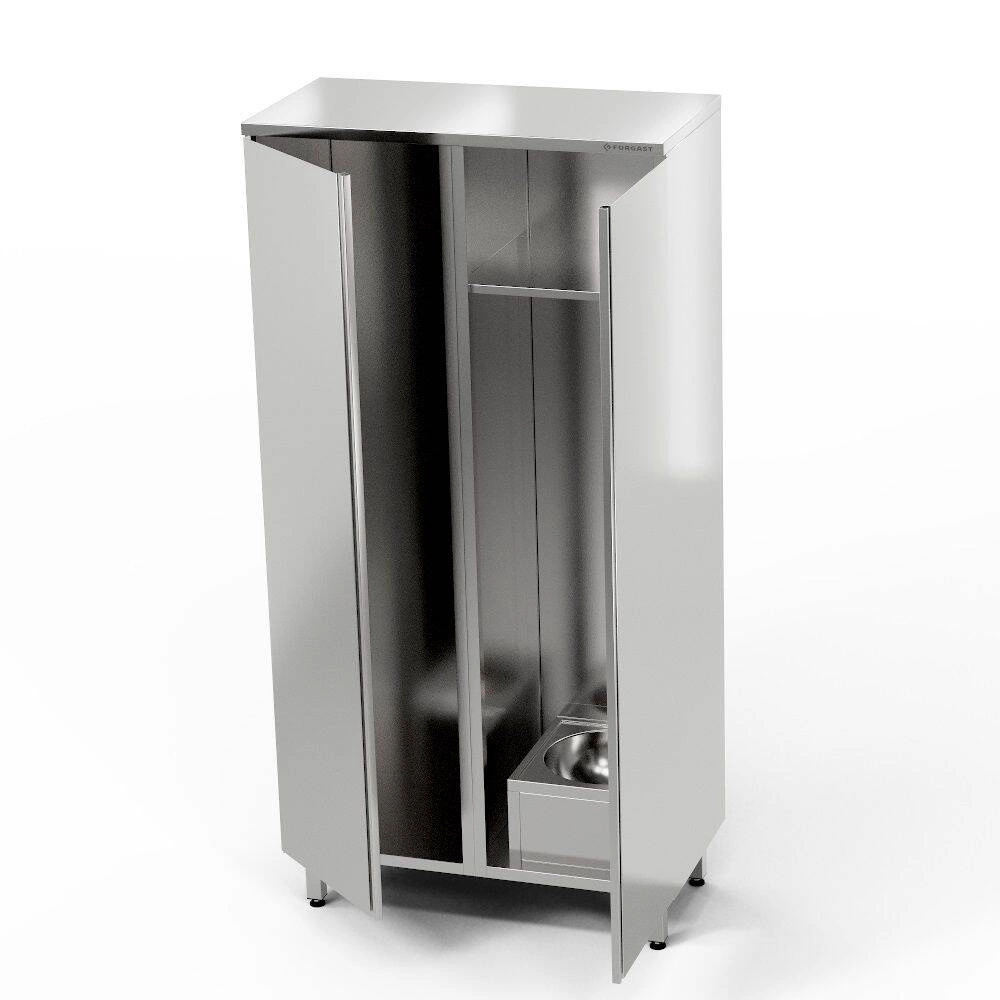 Dvojitá úložná skriňa s umývadlom s rozmermi 100x50x180 cm z nehrdzavejúcej ocele J4. Možnosť výberu umývadlovej misy na pravej alebo ľavej strane. Vetracie otvory. Nastaviteľná polica. Háčiky na oblečenie umiestnené na opačnej strane ako priehradka na umývadlo.