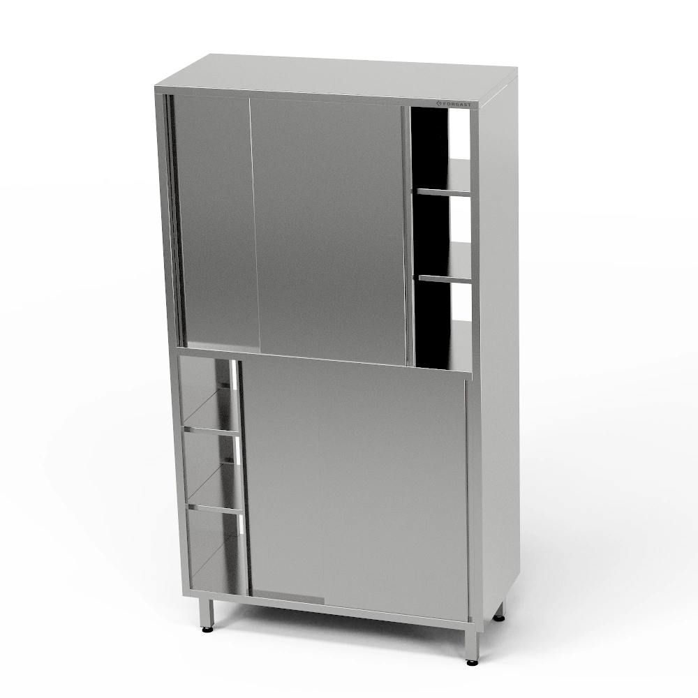 Priechodná delená skriňa s rozmermi 100x60x180 cm z nehrdzavejúcej ocele J4. V skrini sú 2 lavice. Posuvné dvere.