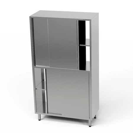 Priechodná delená skriňa s rozmermi 120x60x200 cm z nehrdzavejúcej ocele J4. Skriňa má 2 pólavice. Posuvné dvere.