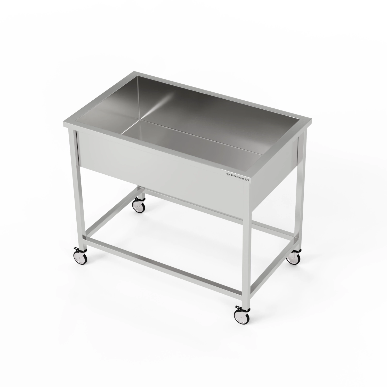 Pojazdný drez FORGAST je postavený na pevnom ráme z uzavretých oceľových profilov, čo zabezpečuje odolnosť a bezpečnosť pri používaní. Zadný ochranný okraj s výškou 4 cm a možnosť montáže bočných okrajov chránia steny a podlahu pred znečistením. Komora s hĺbkou 30 cm umožňuje pohodlné ponorenie veľkých nádob, pričom nastaviteľné nožičky umožňujú prispôsobiť výšku individuálnym potrebám. Odtokový otvor s priemerom 5 cm umožňuje rýchle vyprázdnenie drezu aj pri väčšom množstve vody. Súčasťou je mobilný rám s kolieskami, ktorý výrazne zvyšuje funkčnosť produktu.