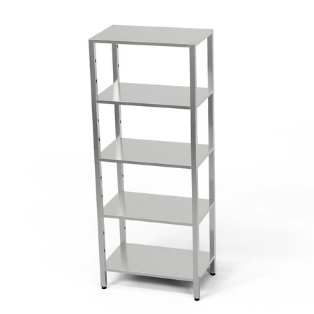 Nerezový regál s 5 policami a tromi nastaviteľnými policami bol navrhnutý s ohľadom na najnáročnejších používateľov. Jeho konštrukcia je založená na uzavretých profiloch, ktoré zabezpečujú vysokú stabilitu a nosnosť aj pri intenzívnom zaťažení. Plné police umožňujú bezpečné skladovanie sypkých produktov a drobných doplnkov a sú vhodné pre miesta, kde je dôležitá ľahká údržba čistoty, ako sú reštauračné kuchyne či potravinové sklady. V balení je kompletný regál s piatimi policami pripravený na samostatnú montáž.