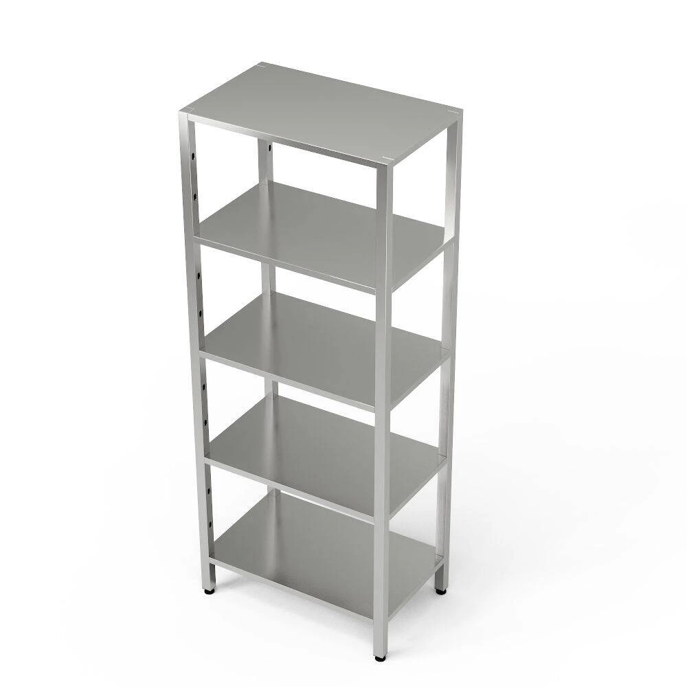 Regál sa skladá z piatich plných políc, z ktorých tri je možné ľubovoľne nastaviť do požadovanej výšky. Takáto konštrukcia umožňuje optimálne využitie regálu v profesionálnych kuchyniach, laboratóriách alebo dielňach, kde sa často skladujú predmety rôznych rozmerov. Uzavreté konštrukčné profily zaručujú stabilitu aj pri veľkých zaťaženiach. Súčasťou balenia je kompletný regál na samostatnú montáž, čo umožňuje rýchlu a jednoduchú prípravu na použitie na vybranom mieste.