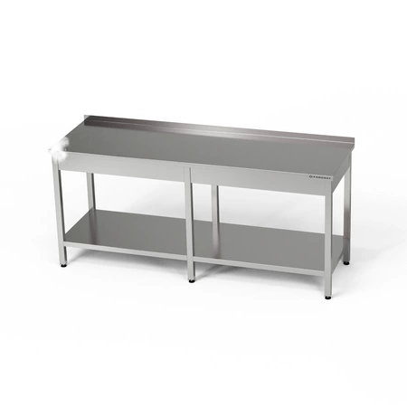 Pracovná stanica so spodným panelom s rozmermi 250x70x85 cm z nerezovej ocele.