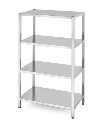 4-miestny skladovací regál z nehrdzavejúcej oceles rozmermi 100x60x180 cm. Vybavená 4 vystuženými nohami z oceľových profilov s maximálnym zaťažením 70 kg/m2. Nohy z profilu 3x3 cm, s nastaviteľnými nožičkami +/-1,5 cm