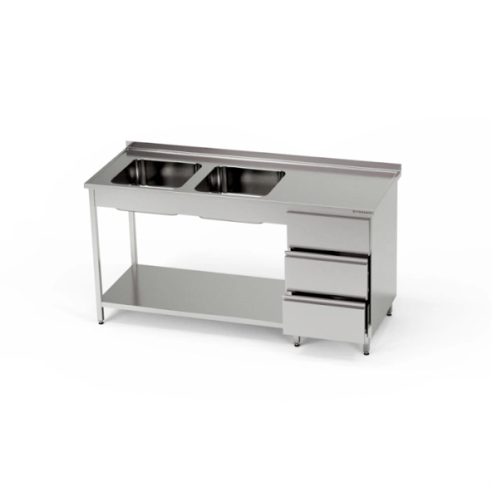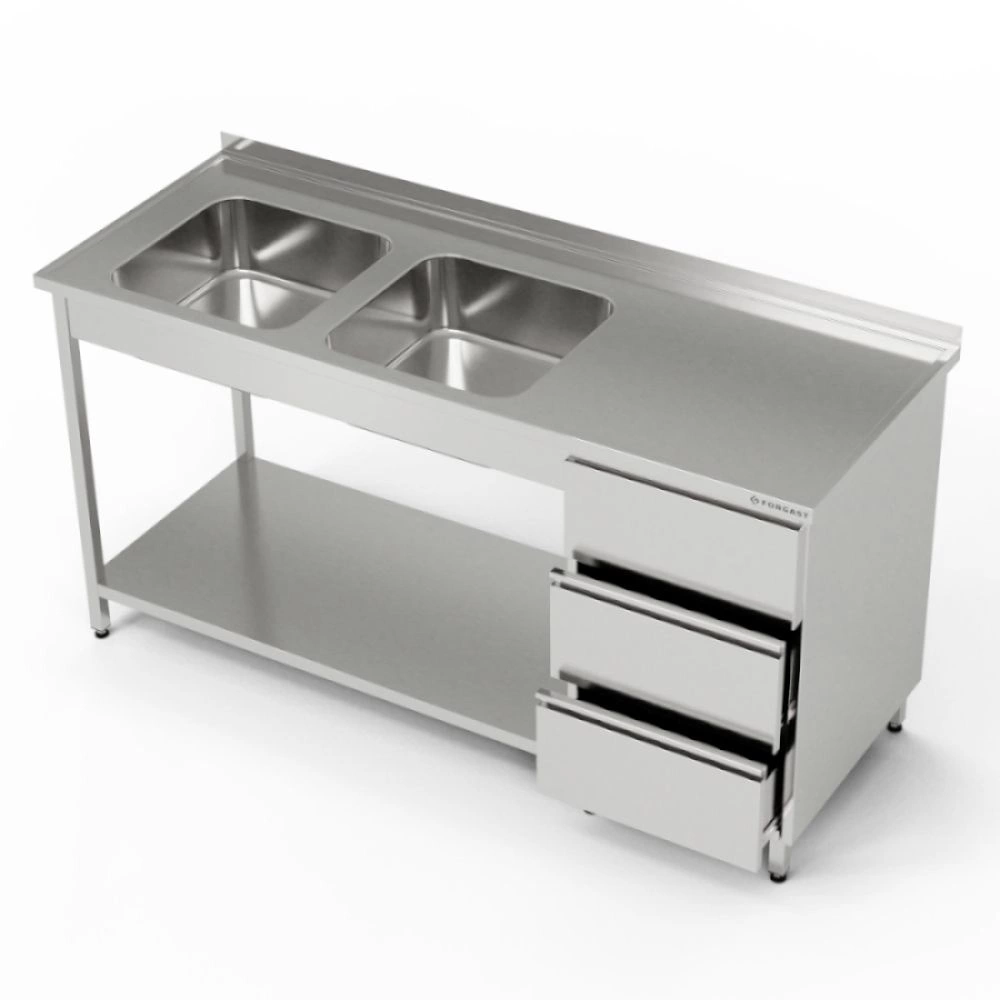 Konštrukcia a súprava – nerezový stôl s dvoma drezovými komorami a blokom troch zásuviek