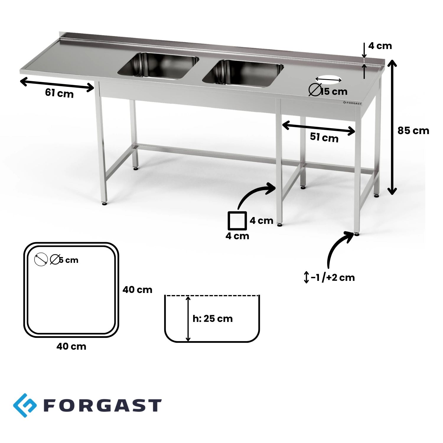 Nerezový stôl s dvojkomorovým drezom, miestom na umývačku riadu a otvorom na odpadky 280x60x85 cm FORGAST