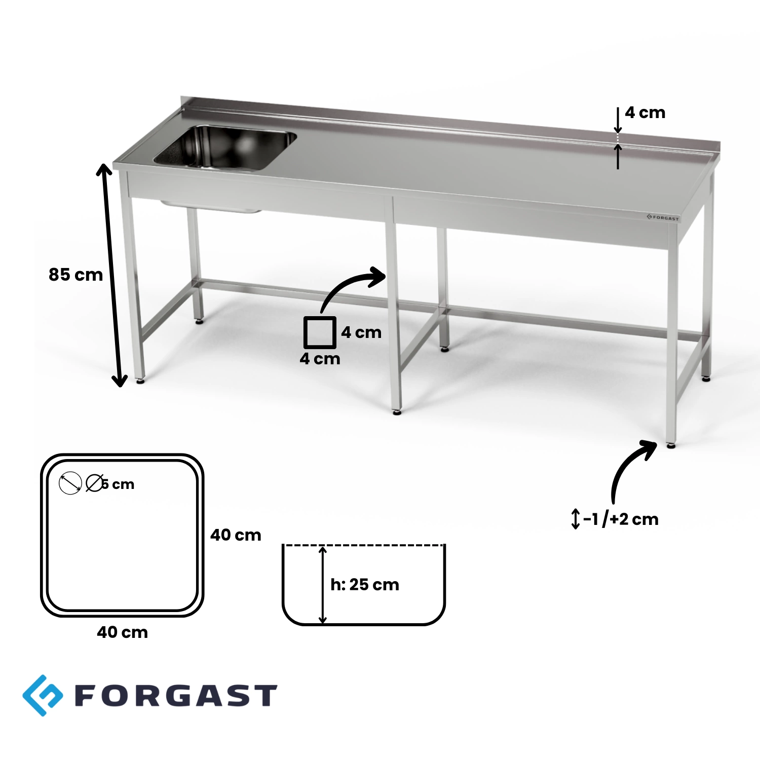 Nerezový stôl s 1-komorovým drezom 280x60x85 cm FORGAST je riešenie, ktoré splní očakávania aj tých najnáročnejších používateľov. Spája trvácnosť, funkčnosť a bezpečnosť používania. Premyslená konštrukcia a možnosť individuálnej konfigurácie spôsobujú, že je ideálny pre potreby profesionálnych kuchýň. Je to investícia, ktorá zabezpečí pohodlie pri práci, jednoduchú údržbu čistoty a dlhú životnosť produktu.