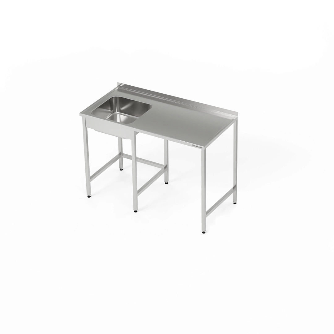 Stôl je vyrobený z vysokokvalitnej nehrdzavejúcej ocele J4, ktorá zabezpečuje odolnosť voči mechanickému poškodeniu a pôsobeniu chemických prostriedkov používaných v gastronómii. Súprava obsahuje pracovnú dosku s profilom 4 mm, komoru drezu s rozmermi 50x40x25 cm, spodnú policu pod drezom, miesto na umývačku riadu pod pracovnou doskou a nastaviteľné nohy. Je možnosť výberu konfigurácie okrajov – zadný, ľavý alebo pravý – čo umožňuje ešte lepšie prispôsobenie stola individuálnym potrebám kuchyne. Štandardne je pripravený otvor na batériu a odtok, na želanie zákazníka je možné vyhotoviť väčší otvor na drvič odpadu.