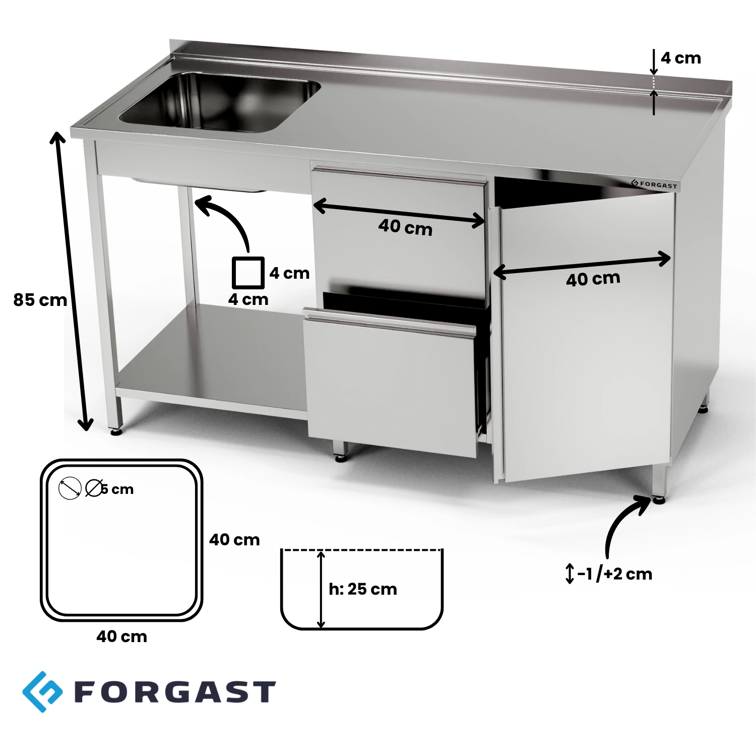Nerezový stôl s drezom, skrinkou, zásuvkami a policou FORGAST je investíciou do trvácnosti, bezpečnosti a pohodlia pri používaní. Vysokokvalitná nehrdzavejúca oceľ zabezpečuje odolnosť voči intenzívnemu používaniu a jednoduchú údržbu hygieny, čo je nevyhnutné v gastronomickom odvetví. Premyslená konštrukcia a možnosť konfigurácie spôsobujú, že tento nábytok sa prispôsobí individuálnym potrebám každej kuchyne. Je to riešenie, ktoré umožní optimalizovať pracovný priestor a zefektívniť každodennú prácu, pričom zároveň zaručí estetický vzhľad a dlhú životnosť produktu.