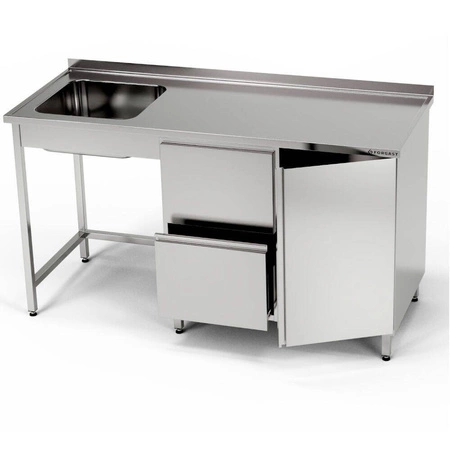 Nerezový stôl s 1-komorovým drezom, skrinkou a blokom zásuviek je funkčné a odolné riešenie pre profesionálne gastronomické kuchyne, výrobné prevádzky či potravinárske dielne. Produkt sa vyznačuje veľkou pracovnou plochou, prítomnosťou skrinky s dvierkami a praktickým blokom zásuviek, čo uľahčuje organizáciu práce a skladovanie kuchynského príslušenstva.