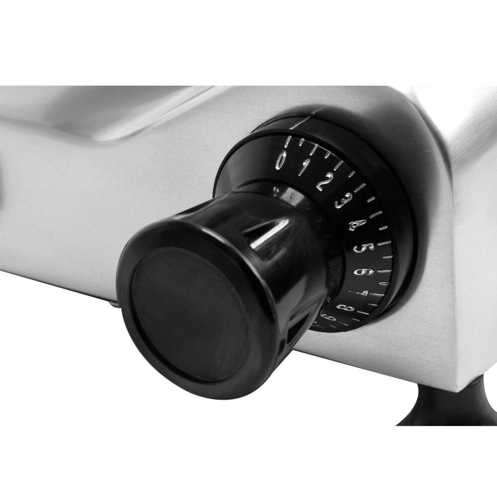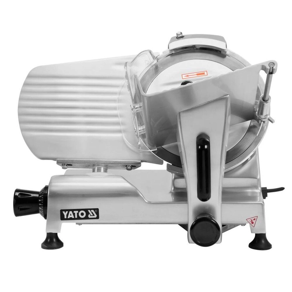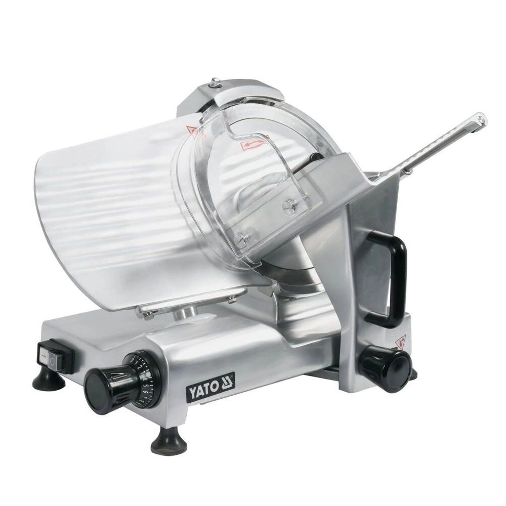 Krájač na klobásy značky YATO s priemerom noža 25 cm. Základňa krájača vyrobená z vysokokvalitnej hliníkovej zliatiny so sivým lakovaným povrchom uľahčuje udržiavanie stroja v čistote. Okrem toho odnímateľný wózek uľahčuje prístup k ťažko prístupným miestam a umožňuje dôkladné vyčistenie stroja od zvyškov nakrájaných výrobkov. Rezací kotúč s priemerom 25 cm umožňuje presné krájanie výrobkovóly až do priemeru 18 cm. Vďaka plynulému nastaveniu hrúbky plátkov je možné získať plátkyós hrúbkou od 0,2 do 12 mm, čím sa prispôsobí rôznorodým potrebám kuchyne. Vzduchom chladený motor s výkonom 150 W nielenže zabraňuje preťaženiu, ale zaručuje aj vysoký výkon a dlhú životnosť stroja. Wózek inštalovaný na vodiacich dráhach s ložiskami sa pohybuje ľahko a hladko, čo výrazne znižuje námahu pri rezaní. Okrem toho skosené umiestnenie rezacieho mechanizmu umožňuje gravitačné pritláčanie krájaných výrobkovót na kotúč, čo ďalej zlepšuje proces.