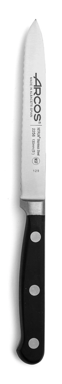 Nôž na paradajky zo série ÓPERA od spoločnosti Arcos je presný nástroj určený na krájanie jemnej zeleniny a ovocia, napríklad paradajok. Tento nôž je vybavený zúbkovanou čepeľou, vďaka ktorej si dokonale poradí s tvrdou šupkou ovocia a zároveň zachová neporušený jemný vnútrajšok. Čepeľ je vyrobená z inovatívnej nehrdzavejúcej ocele NITRUM®, ktorá poskytuje zvýšenú tvrdosť a odolnosť proti korózii, čo má za následok dlhú životnosť a spoľahlivosť nástroja. Vďaka hodvábnemu ostriu poskytuje nôž výnimočnú presnosť rezu a pohodlná a dokonale vyvážená rukoväť z odolného materiálu POM zaručuje pohodlie pri práci. Rukoväť, ktorá je so střenkou spojená nitmi z nehrdzavejúcej ocele, ďalej spevňuje konštrukciu noža a profilácia chrániaca prsty zvyšuje bezpečnosť pri používaní.