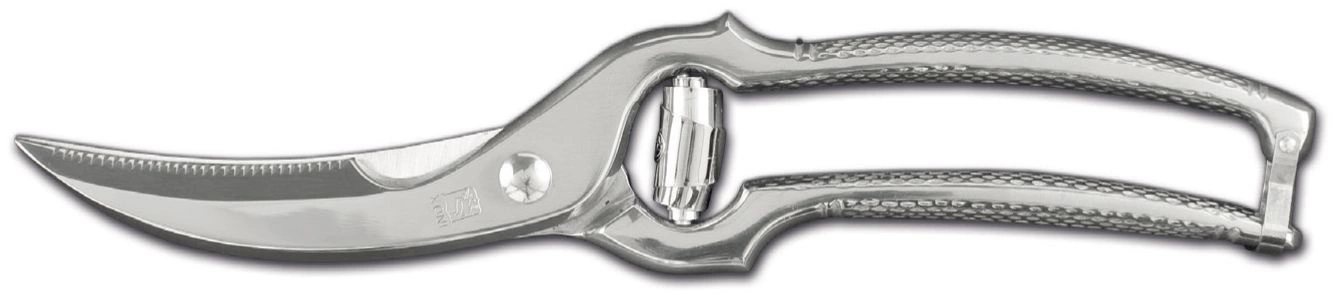 Nožnice na hydinu Ambrogio Sanelli Vyrobené z nehrdzavejúcej ocele AISI 420B, tvrdosť 54-55 HRC. Zakrivené čepele, spodné čepele s ostrými reznými zubami. Nožnice majú tvarovanú rukoväť s drsným povrchom, takže sa dobre držia v ruke. Blokovací mechanizmus zabraňujúci náhodnému otvoreniu. Pružina, ktoráóra uľahčuje hladký chod nožníc.