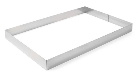 Obdĺžnikový okraj na pečivo a cukrovinky 38,5x28,5 cm. . Vyrobené z nehrdzavejúcej ocele. Ideálne na tvarovanie koláčov a pokrmov. Hrúbka nehrdzavejúcej ocele 1,5 mm.