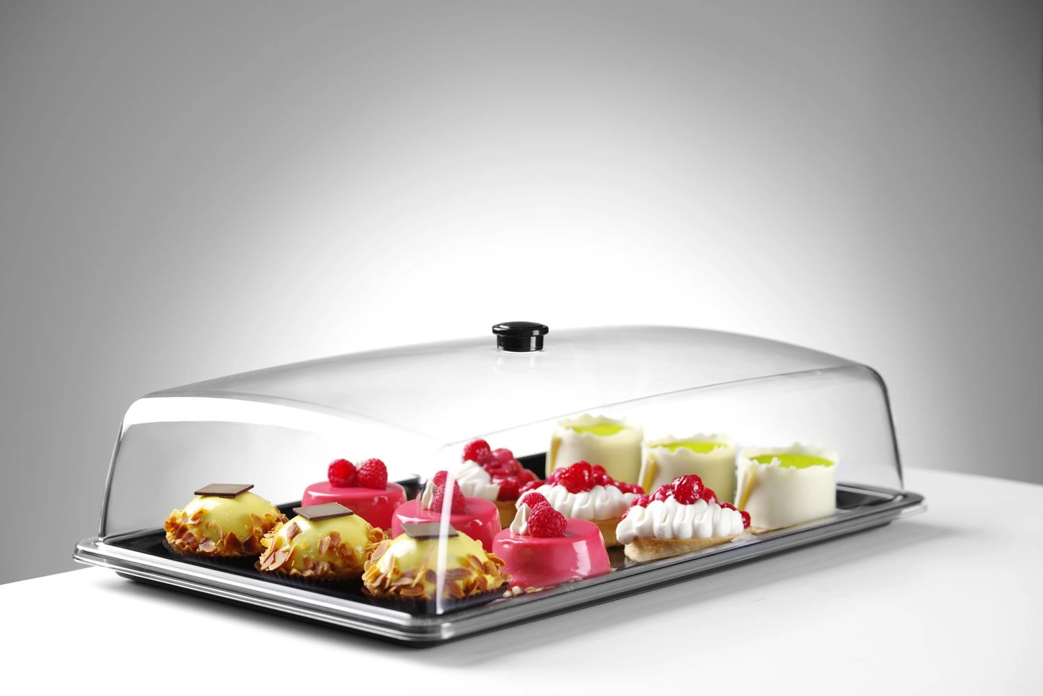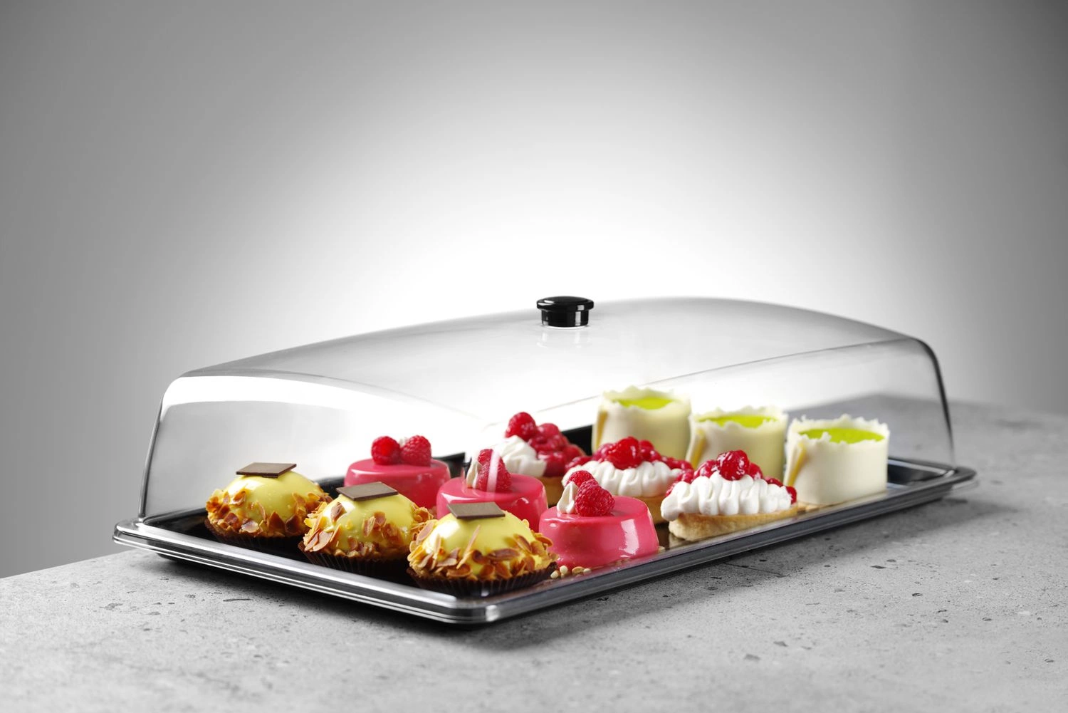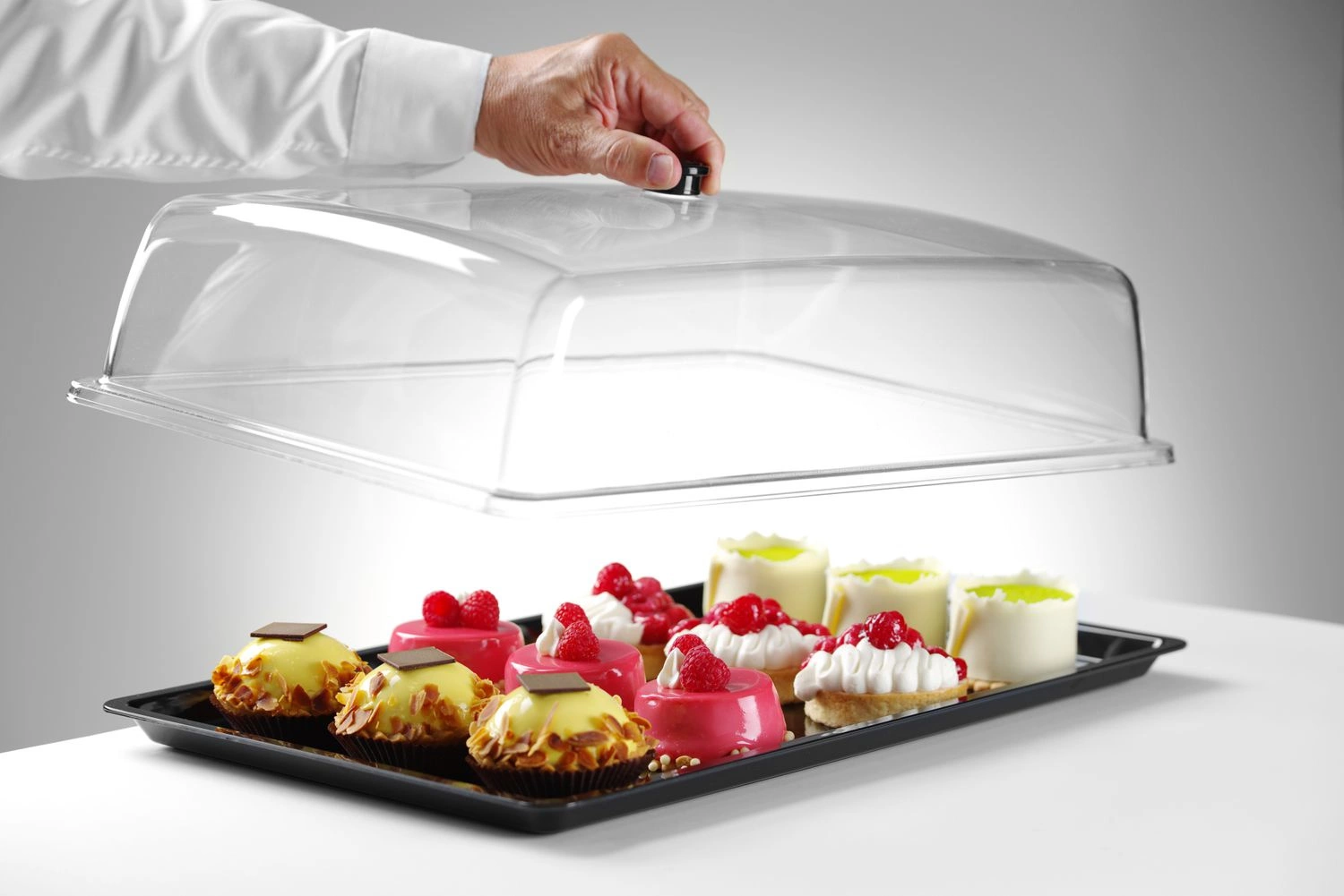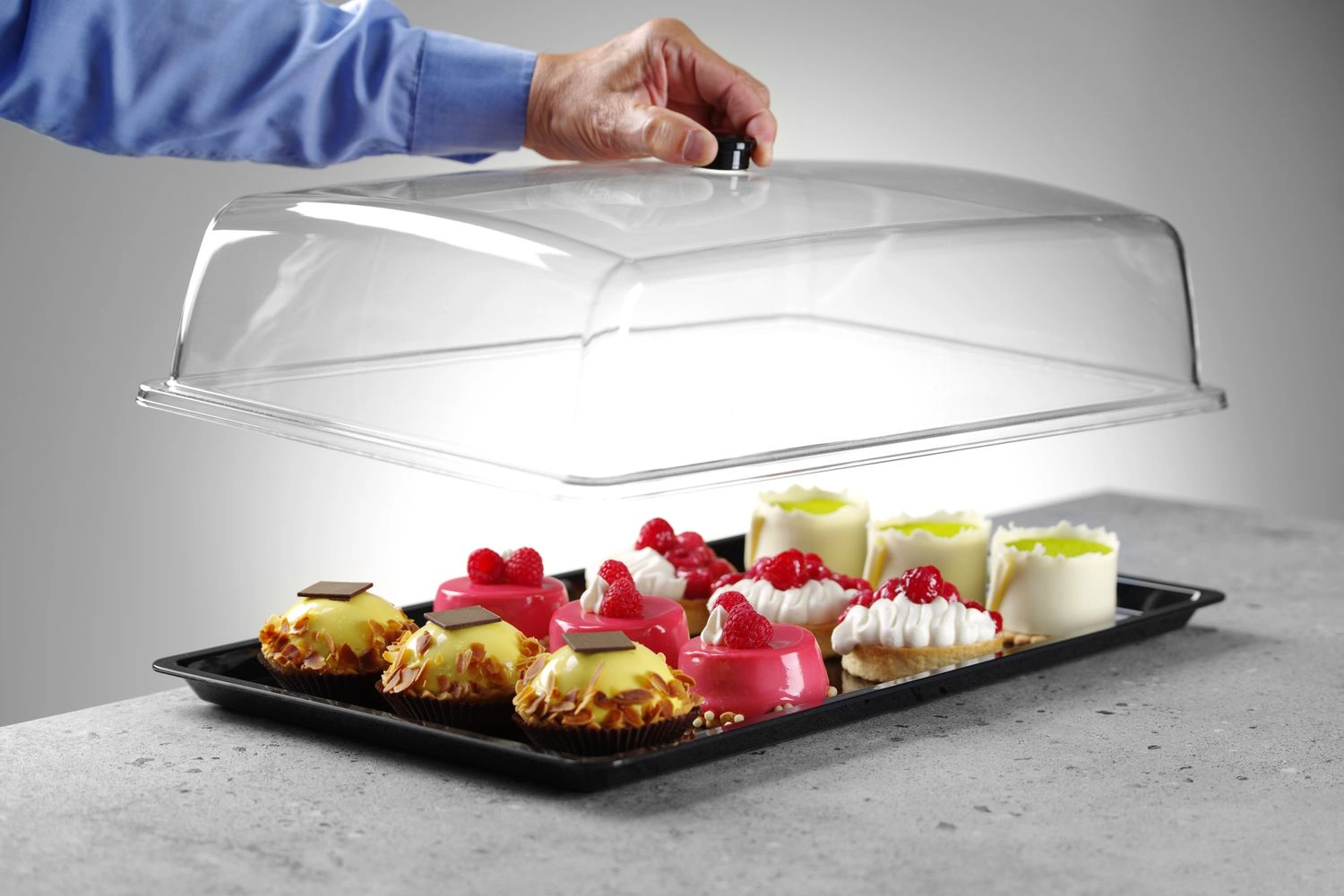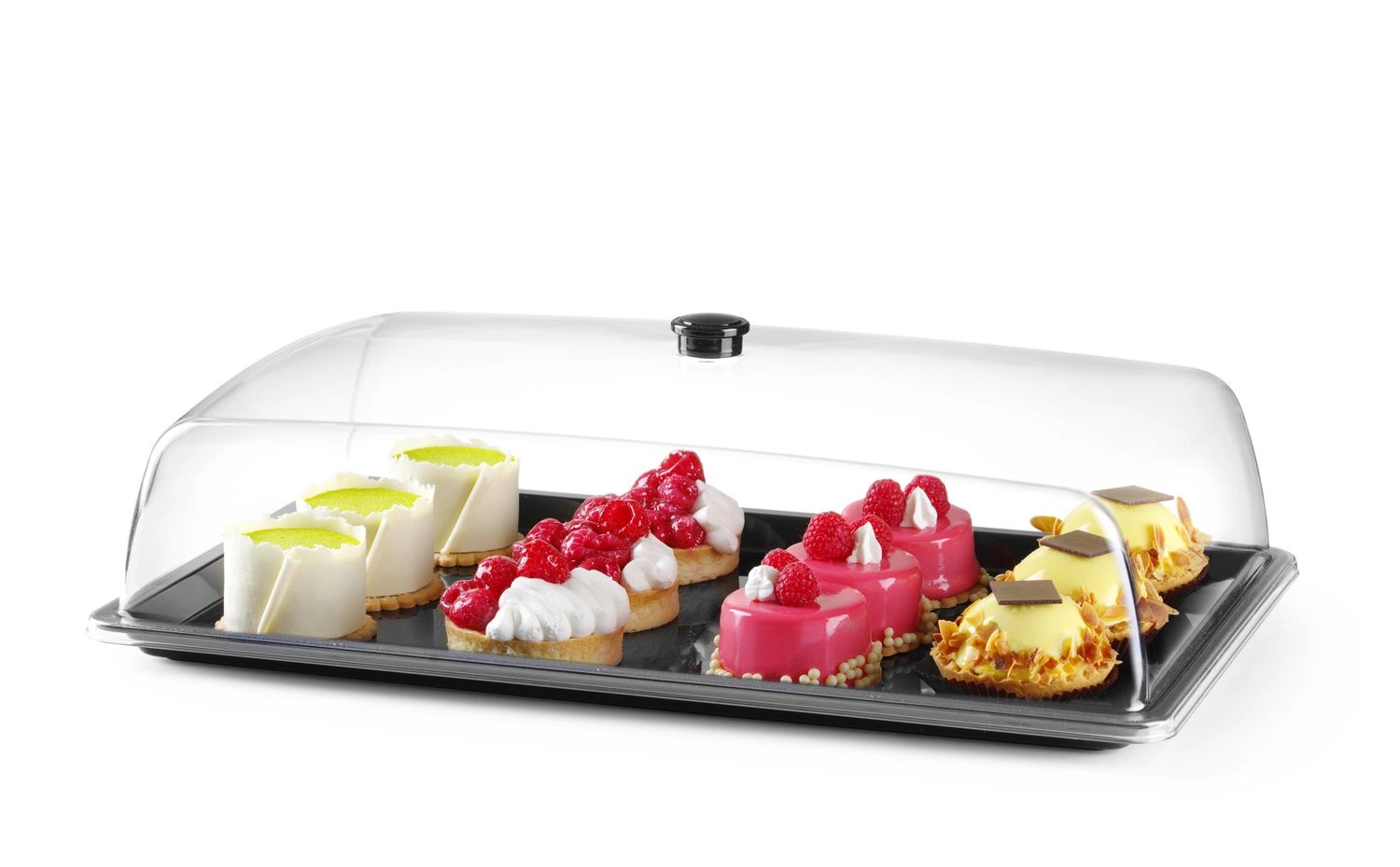 Obdĺžnikový podnos s odnímateľným vekom Hendi s rozmermi 53,5x33,5x16,5 cm. Zásobník vyrobený z čierneho polykarbonátu. Veko je vyrobené z priehľadného polykarbonátu s praktickou rukoväťou. Materiál podnosu a veka schválený pre styk s potravinami, neabsorbuje chuteópachyów. Vanička a veko odolné voči teplotám od -40 do +99 stupňov Celzia. Celé zariadenie je vhodné na umývanie v umývačke riadu. Celý výrobok je v prípade poškodenia recyklovateľný.