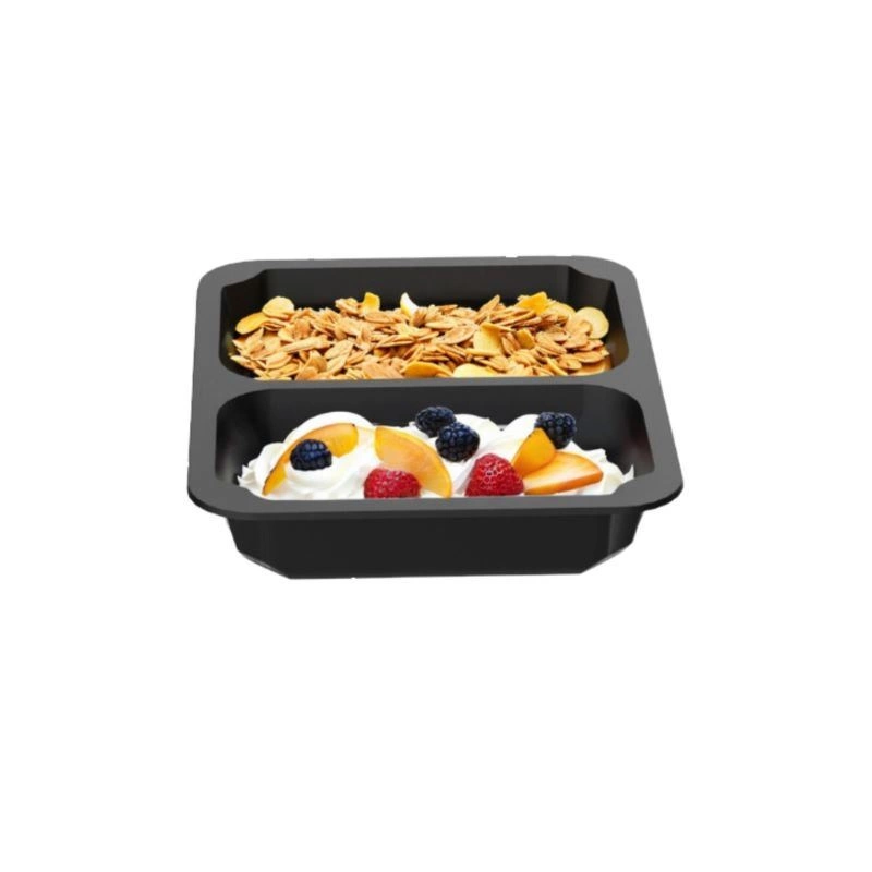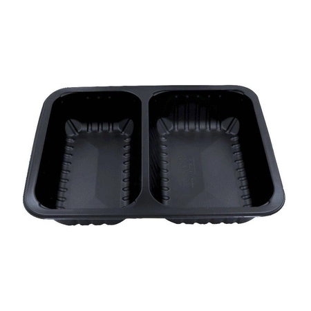 Nádoba na obed s 2 priehradkami s rozmermi 22,7x17,8x5 cm na jedlo so sebou. Nádoba je vyrobená z čierneho recyklovateľného polypropylénu. Určená na uzatváranie jedál na donášku v uzatváracích strojoch.