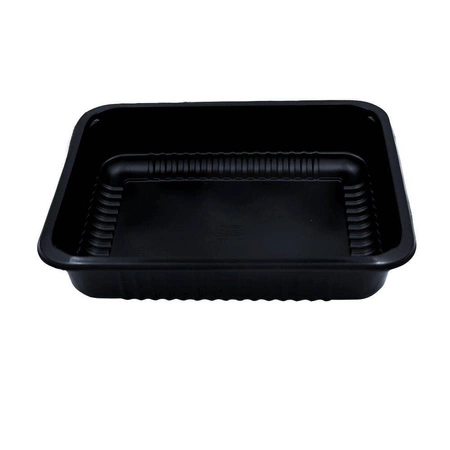 Nevyložená nádoba na obed s rozmermi 22,7 × 17,8 × 5 cm na jedlo so sebou. Nádoba je vyrobená z čierneho recyklovateľného polypropylénu. Určená na uzatváranie jedál na donášku v uzatváracích strojoch.