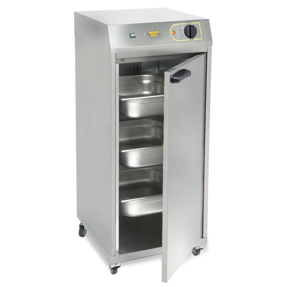 Ohrievač tanierov ROLLER GRILL HVC 60 GN sa vyznačuje pevnou skrinkovou konštrukciou s dvierkami na magnet, čo zabraňuje úniku tepla a uľahčuje prístup do vnútra. Vnútro zariadenia je vybavené praktickou nádobou na vodu – vďaka tomu ohrievané jedlá a riad nevysychajú a zachovávajú si svoje chuťové vlastnosti. To je obzvlášť dôležité pri servírovaní horúcich bufetových jedál alebo obsluhe veľkých akcií. Zariadenie neobsahuje GN nádoby v balení, takže si ich používateľ môže vybrať podľa vlastných potrieb. Stabilitu a mobilitu zaisťujú štyri kolieska, ktoré umožňujú pohodlné presúvanie ohrievača na akékoľvek miesto v kuchyni alebo banketovej sále.