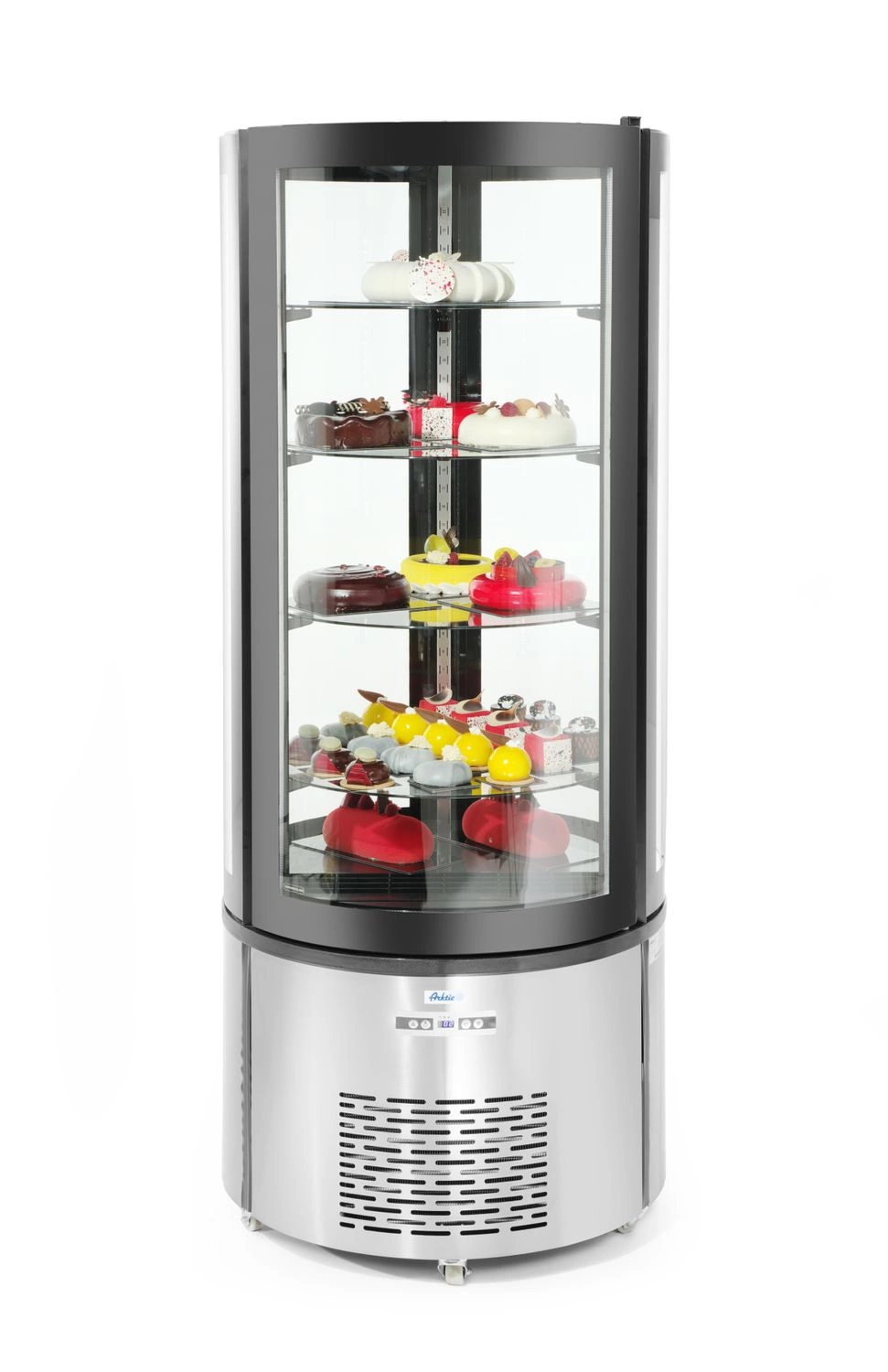 Okrúhla chladiaca vitrína s objemom 360 l je moderné zariadenie určené na profesionálne vystavovanie a uchovávanie zákuskov, dezertov a ďalších produktov, ktoré vyžadujú nízku teplotu. Charakteristická okrúhla konštrukcia s LED osvetlením a dynamickým chladiacim systémom zabezpečuje, že prezentácia produktov je nielen estetická, ale aj efektívna. Ideálna voľba pre cukrárne, kaviarne a reštaurácie, kde je elegantná expozícia a vhodné chladiace podmienky kľúčové.