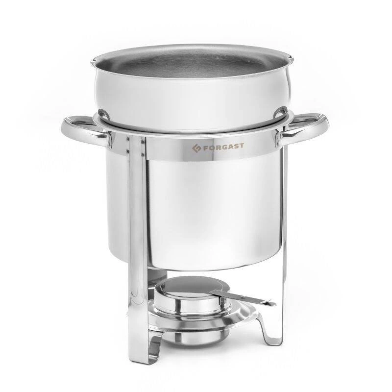 Okrúhly ohrievač na polievku 11 l na palivo FORGAST FG03111 je profesionálne gastronomické zariadenie, ktoré umožňuje pohodlné a efektívne servírovanie horúcich jedál na rôznych eventoch a v gastronomických prevádzkach. Vyznačuje sa veľkou kapacitou a odolnou oceľovou konštrukciou, vďaka čomu je ideálny na intenzívne používanie počas svadieb, banketov či vonkajších akcií.