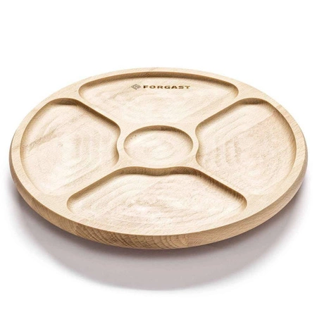 Otočná drevená doska na servírovanie 4 komory FORGAST FG12650 je praktický a elegantný prvok vybavenia každej kuchyne, reštaurácie alebo baru. Vyniká prírodným bukovým povrchom a funkčným rozdelením na štyri komory a centrálny priestor na omáčky. Ideálna na servírovanie syrov, údenín, pochutín alebo iných jedál, uplatní sa ako pri domácich stretnutiach, tak aj v profesionálnej gastronómii.