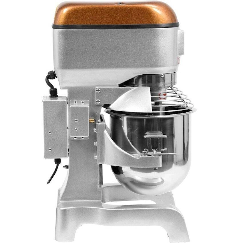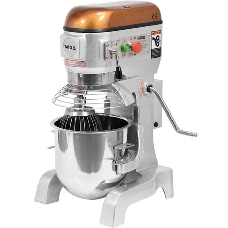 Planétový mixér značky YATO s objemom 10L, určený na prípravu ľahkých ciest, šľahanie peny a miešanie plnky. Disponuje tromi pracovnými rýchlosťami 110 / 178 / 355 ot./min., vďaka čomu je možné jednoducho prispôsobiť režim práce podľa potreby. Zariadenie je navyše vybavené bezpečnostným vypínačom, ktorý automaticky preruší prevádzku. Telo vyrobené z hliníka a ocele, natreté v metalickej striebornej farbe, sa ľahko udržiava v čistote. Misa a ďalšie príslušenstvo sú vyrobené z nehrdzavejúcej ocele určenej na styk s potravinami.