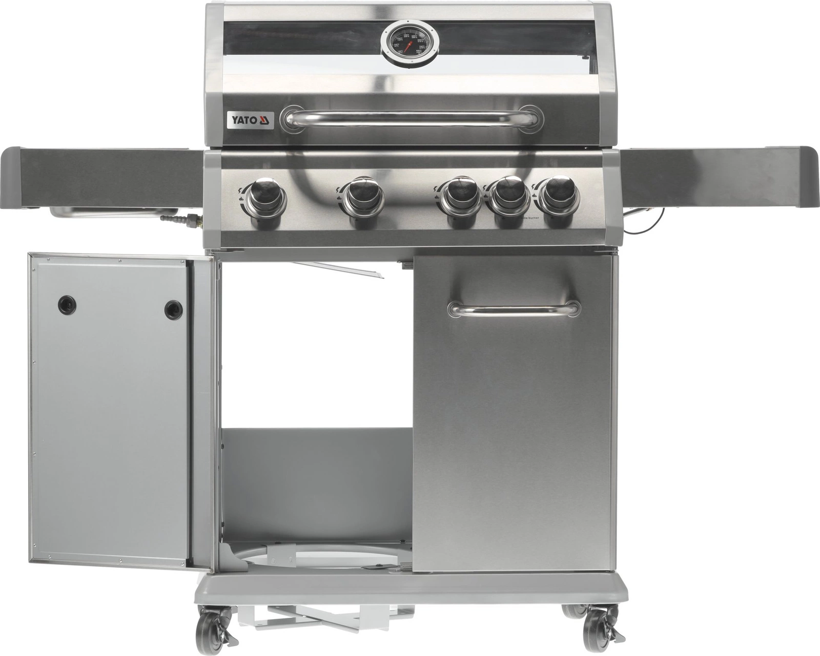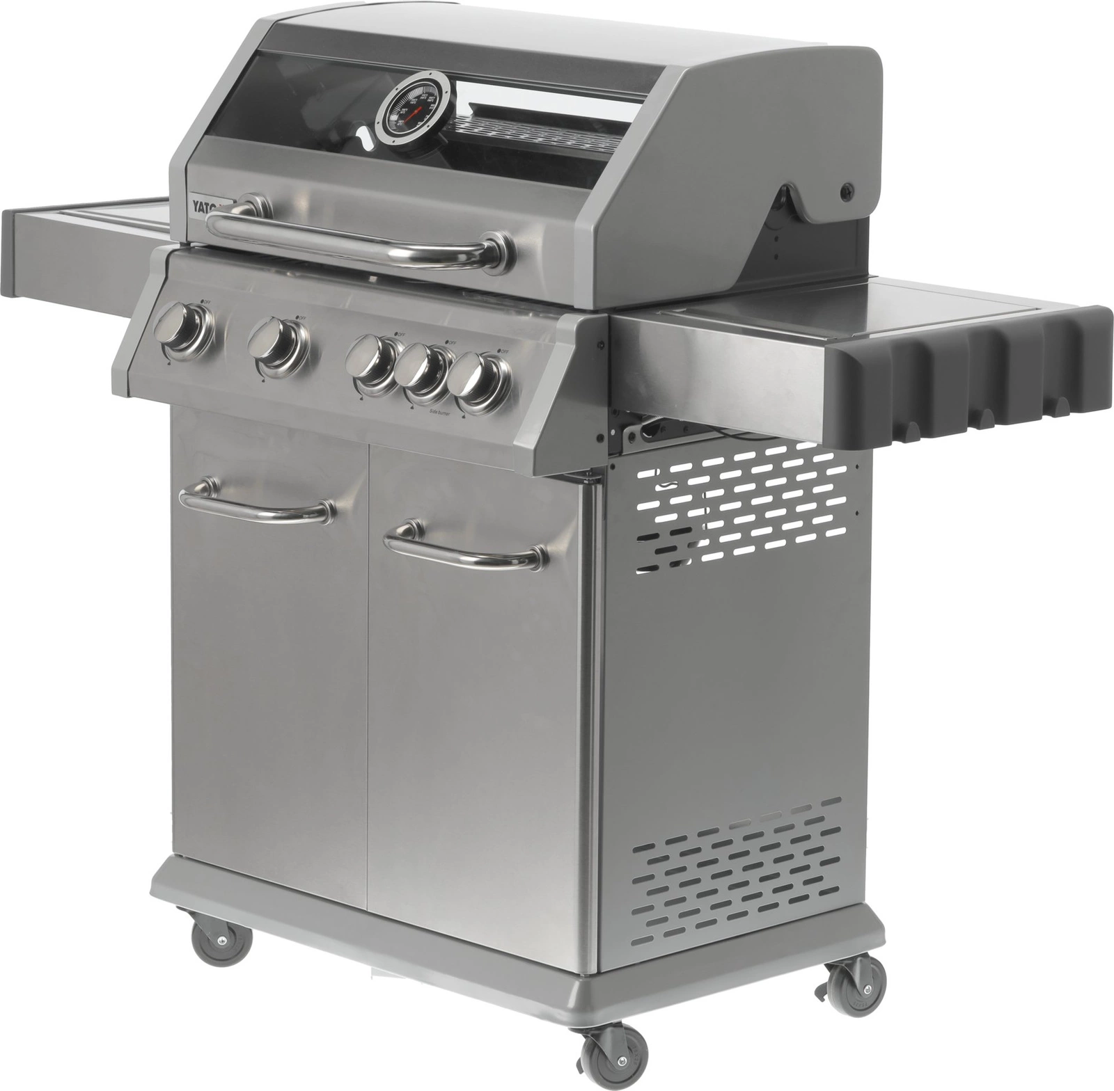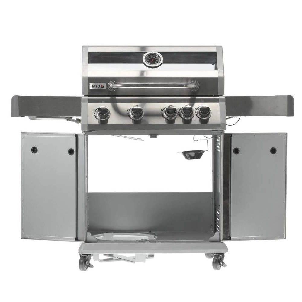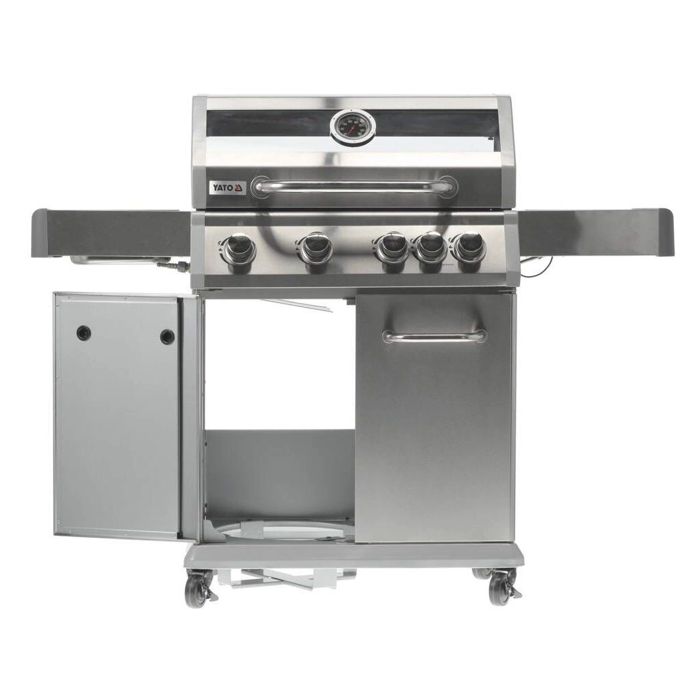 Plynový gril 4+1 značky YATO s rozmermi 133x57x112 cm je vyrobený z vysoko kvalitnej nehrdzavejúcej ocele. Centrálnym prvkom grilu je rýchlo sa nahrievajúci rebrovaný liatinový rošt s rozmermi 70x41,5 cm – 3 rošty: 22,5x41,5 cm (2 ks), 22x41,5 cm (1 ks), ktorý dlho udržiava teplo. Gril navyše disponuje vyberateľným okrúhlym roštom s priemerom 30 cm, ktorý je zabudovaný do hlavného roštu. Tento prvok je možné jednoducho nahradiť kameňom na pizzu (nie je súčasťou balenia), čo rozširuje možnosti využitia grilu. Pohodlie pri používaní zvyšujú bočné police a priestranná uzatvárateľná skrinka, ktoré uľahčujú skladovanie potrebného príslušenstva, korenín a iného vybavenia. Ďalší bočný horák s výkonom 2,2 kW otvára nové možnosti, umožňuje varenie a ohrievanie jedál v hrnci alebo na panvici. Výhodou je miesto na 11l slovenskú plynovú fľašu, nerezová nádoba umiestnená v jednej z bočných políc a zabudovaný otvárač na fľaše.