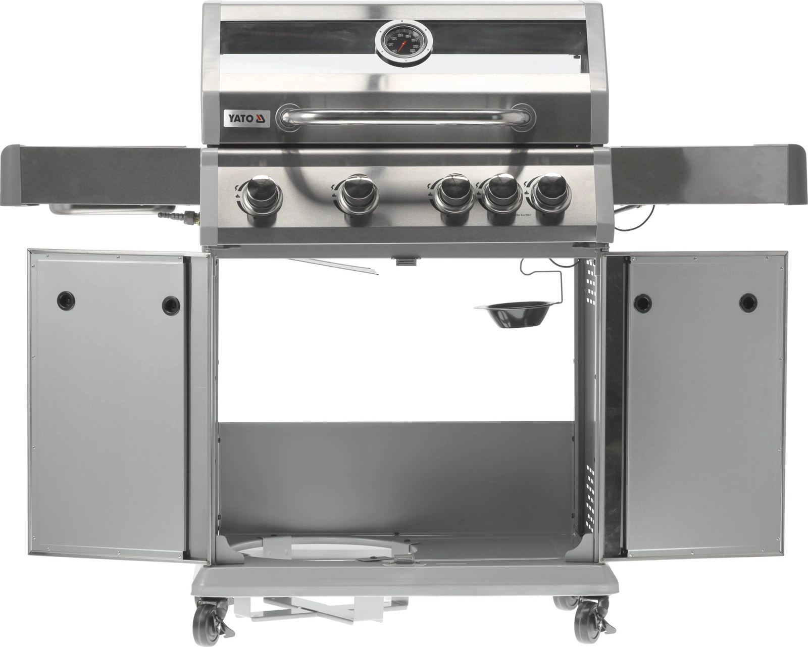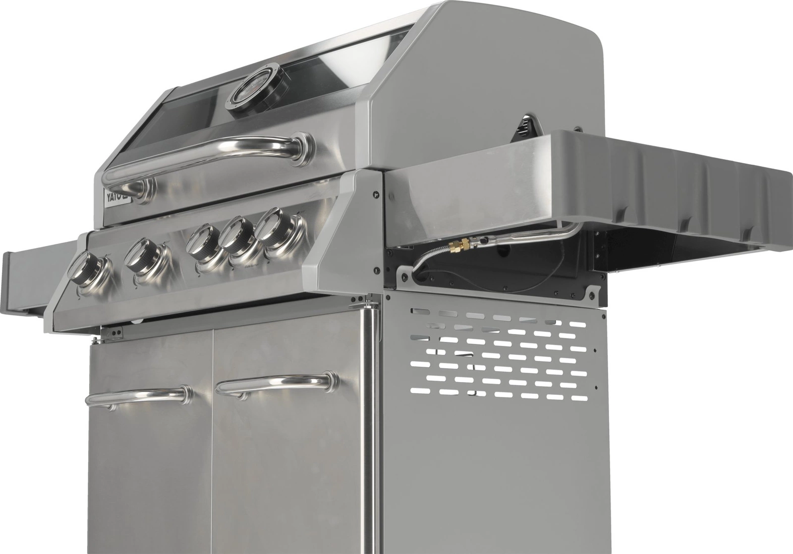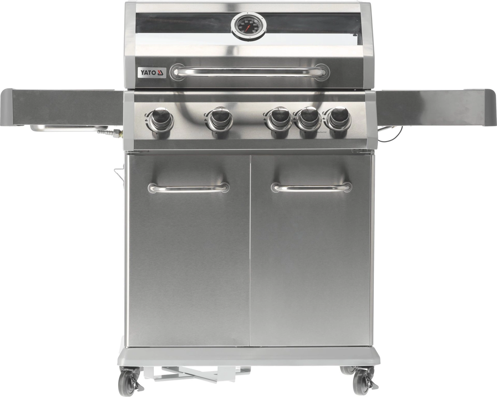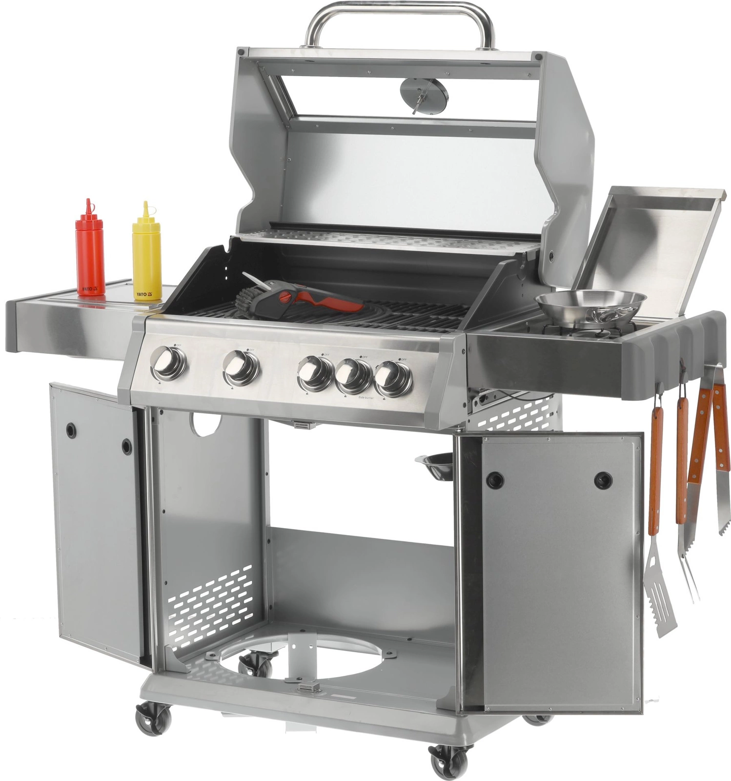 Plynový gril 4+1 značky YATO s rozmermi 133x57x112 cm je vyrobený z vysoko kvalitnej nehrdzavejúcej ocele. Centrálnym prvkom grilu je rýchlo sa nahrievajúci rebrovaný liatinový rošt s rozmermi 70x41,5 cm – 3 rošty: 22,5x41,5 cm (2 ks), 22x41,5 cm (1 ks), ktorý dlho udržiava teplo. Gril navyše disponuje vyberateľným okrúhlym roštom s priemerom 30 cm, ktorý je zabudovaný do hlavného roštu. Tento prvok je možné jednoducho nahradiť kameňom na pizzu (nie je súčasťou balenia), čo rozširuje možnosti využitia grilu. Pohodlie pri používaní zvyšujú bočné police a priestranná uzatvárateľná skrinka, ktoré uľahčujú skladovanie potrebného príslušenstva, korenín a iného vybavenia. Ďalší bočný horák s výkonom 2,2 kW otvára nové možnosti, umožňuje varenie a ohrievanie jedál v hrnci alebo na panvici. Výhodou je miesto na 11l slovenskú plynovú fľašu, nerezová nádoba umiestnená v jednej z bočných políc a zabudovaný otvárač na fľaše.