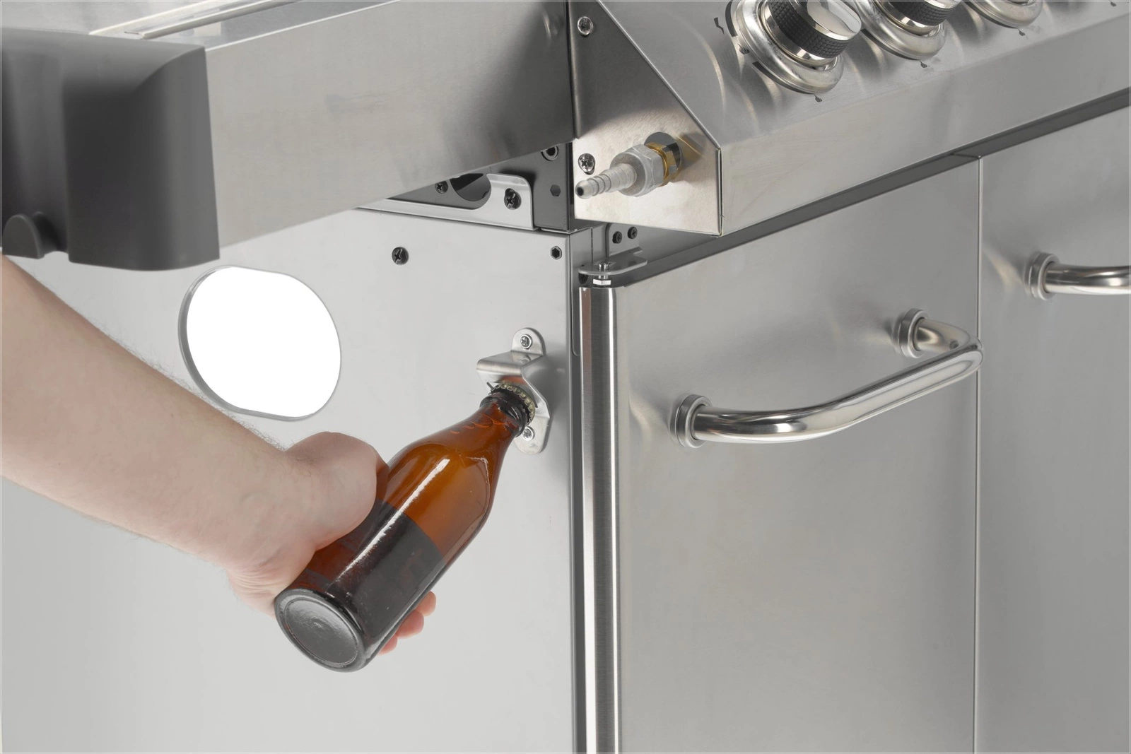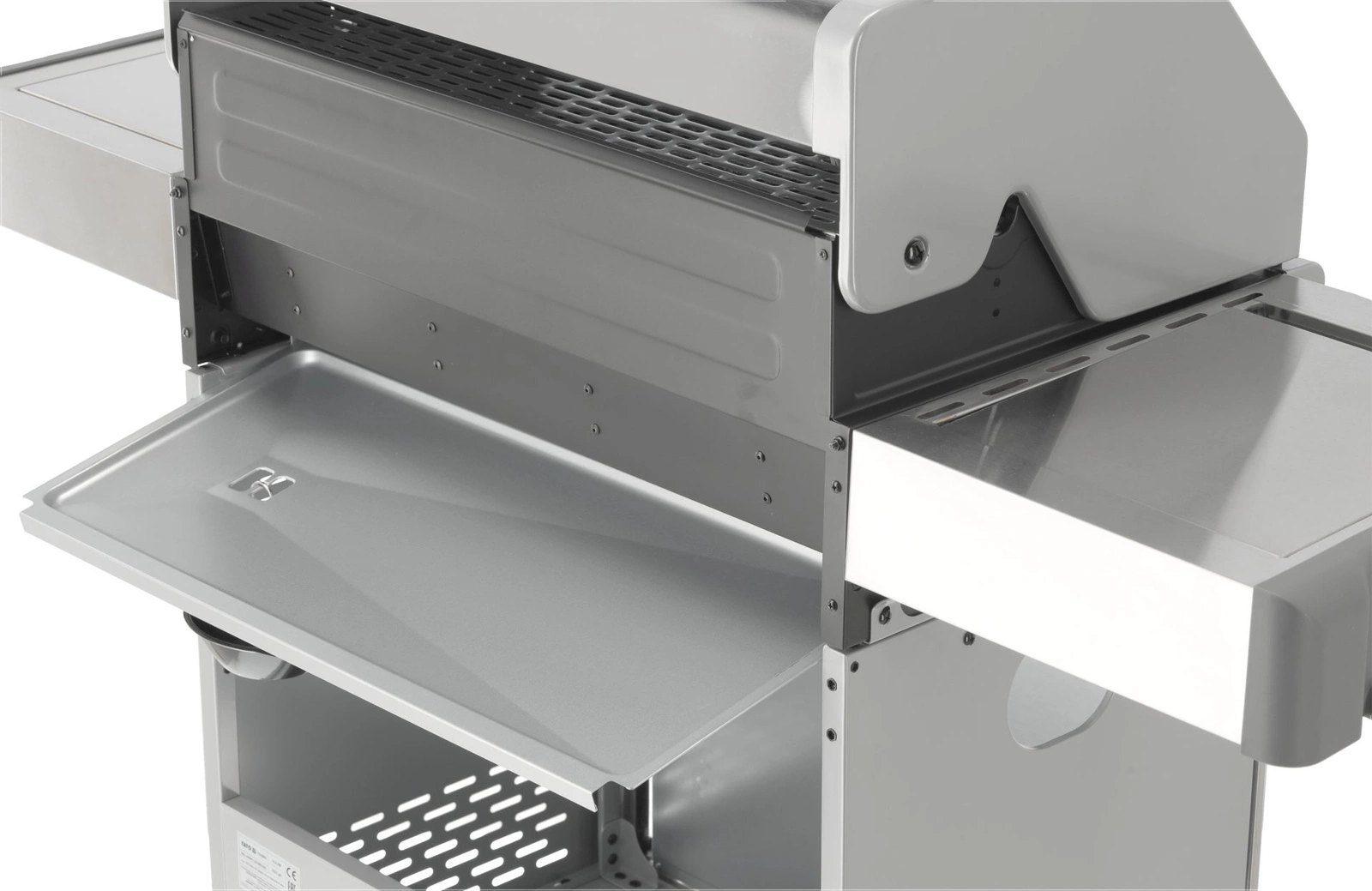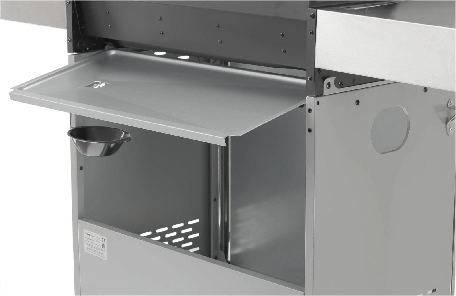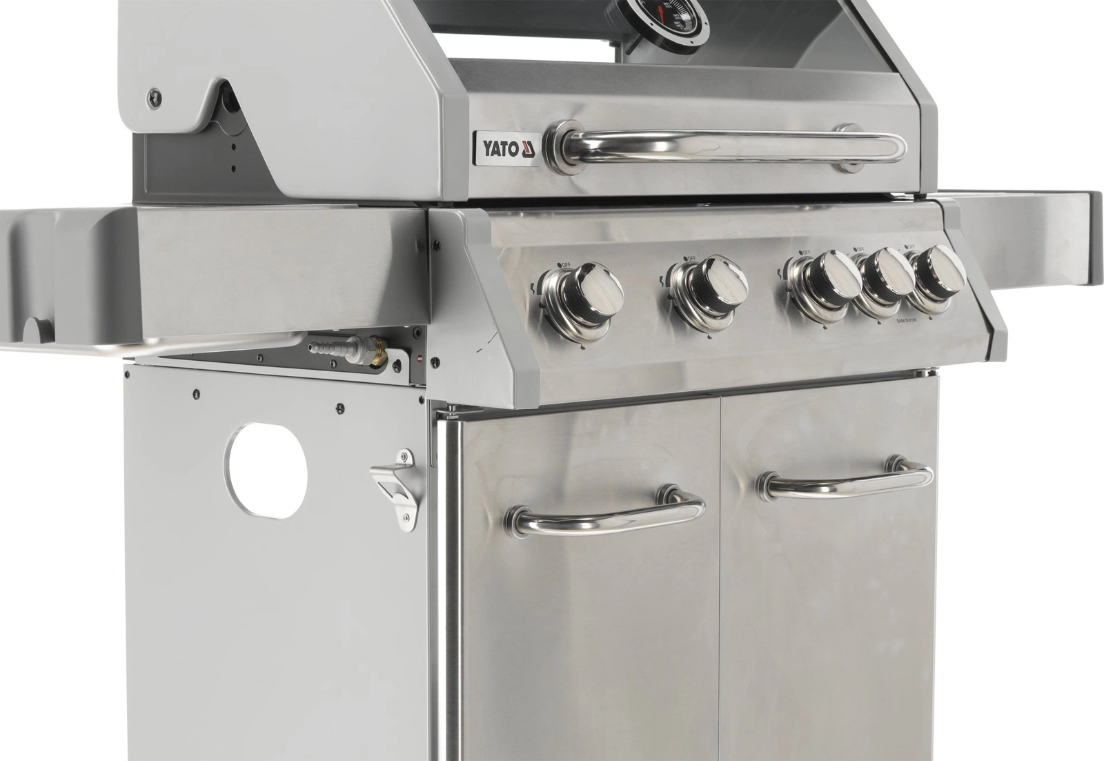 Plynový gril 4+1 značky YATO s rozmermi 133x57x112 cm je vyrobený z vysoko kvalitnej nehrdzavejúcej ocele. Centrálnym prvkom grilu je rýchlo sa nahrievajúci rebrovaný liatinový rošt s rozmermi 70x41,5 cm – 3 rošty: 22,5x41,5 cm (2 ks), 22x41,5 cm (1 ks), ktorý dlho udržiava teplo. Gril navyše disponuje vyberateľným okrúhlym roštom s priemerom 30 cm, ktorý je zabudovaný do hlavného roštu. Tento prvok je možné jednoducho nahradiť kameňom na pizzu (nie je súčasťou balenia), čo rozširuje možnosti využitia grilu. Pohodlie pri používaní zvyšujú bočné police a priestranná uzatvárateľná skrinka, ktoré uľahčujú skladovanie potrebného príslušenstva, korenín a iného vybavenia. Ďalší bočný horák s výkonom 2,2 kW otvára nové možnosti, umožňuje varenie a ohrievanie jedál v hrnci alebo na panvici. Výhodou je miesto na 11l slovenskú plynovú fľašu, nerezová nádoba umiestnená v jednej z bočných políc a zabudovaný otvárač na fľaše.