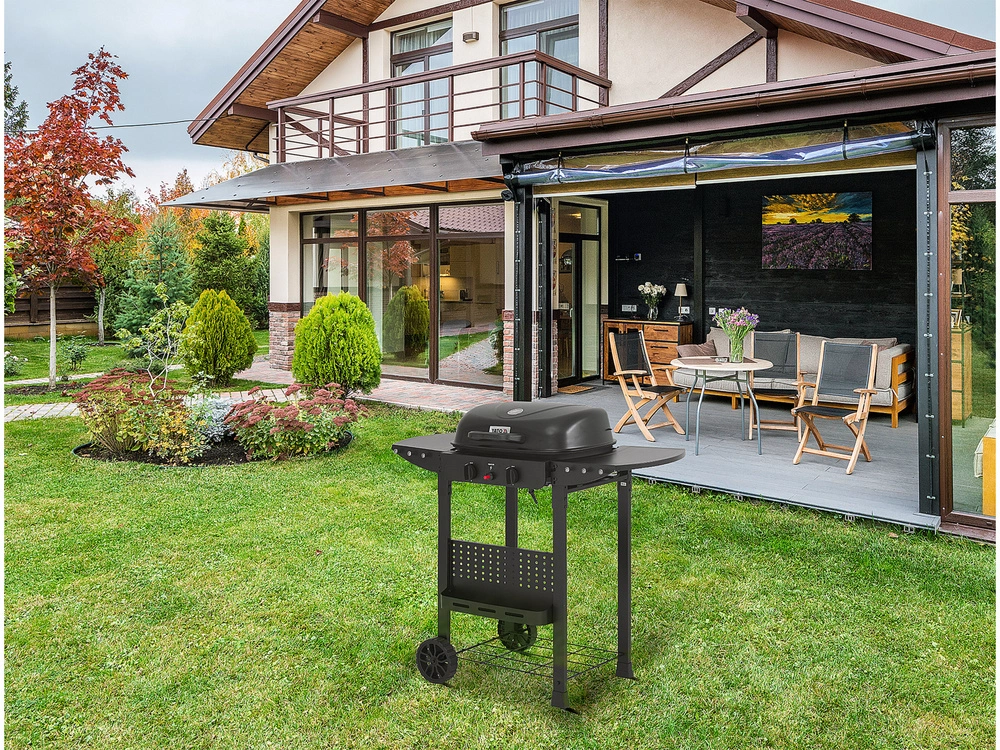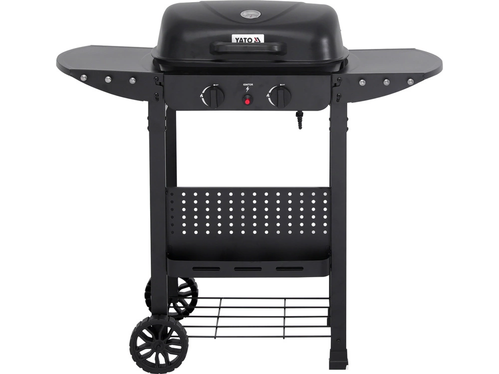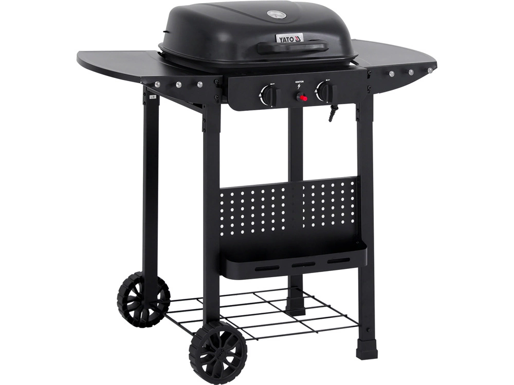 Voľne stojaci plynový gril YATO ASAHI je ideálnym riešením pre pohodlné grilovanie na čerstvom vzduchu – v záhrade, na terase alebo na chate. Je vybavený dvoma výkonnými plynovými horákmi s celkovým výkonom 5 kW a smaltovaným roštom s rozmermi 47 x 37 cm s dodatočnou mriežkou na ohrievanie jedál. Sklopné bočné poličky a praktické háčiky na príslušenstvo zvyšujú funkčnosť zariadenia.