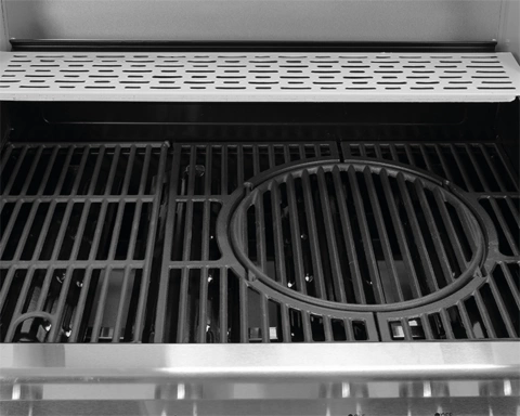 • Veľký liatinový rošt (82 x 41,5 cm) s vymeniteľným okrúhlym roštom umožňuje použitie kamennej platne na pizzu.